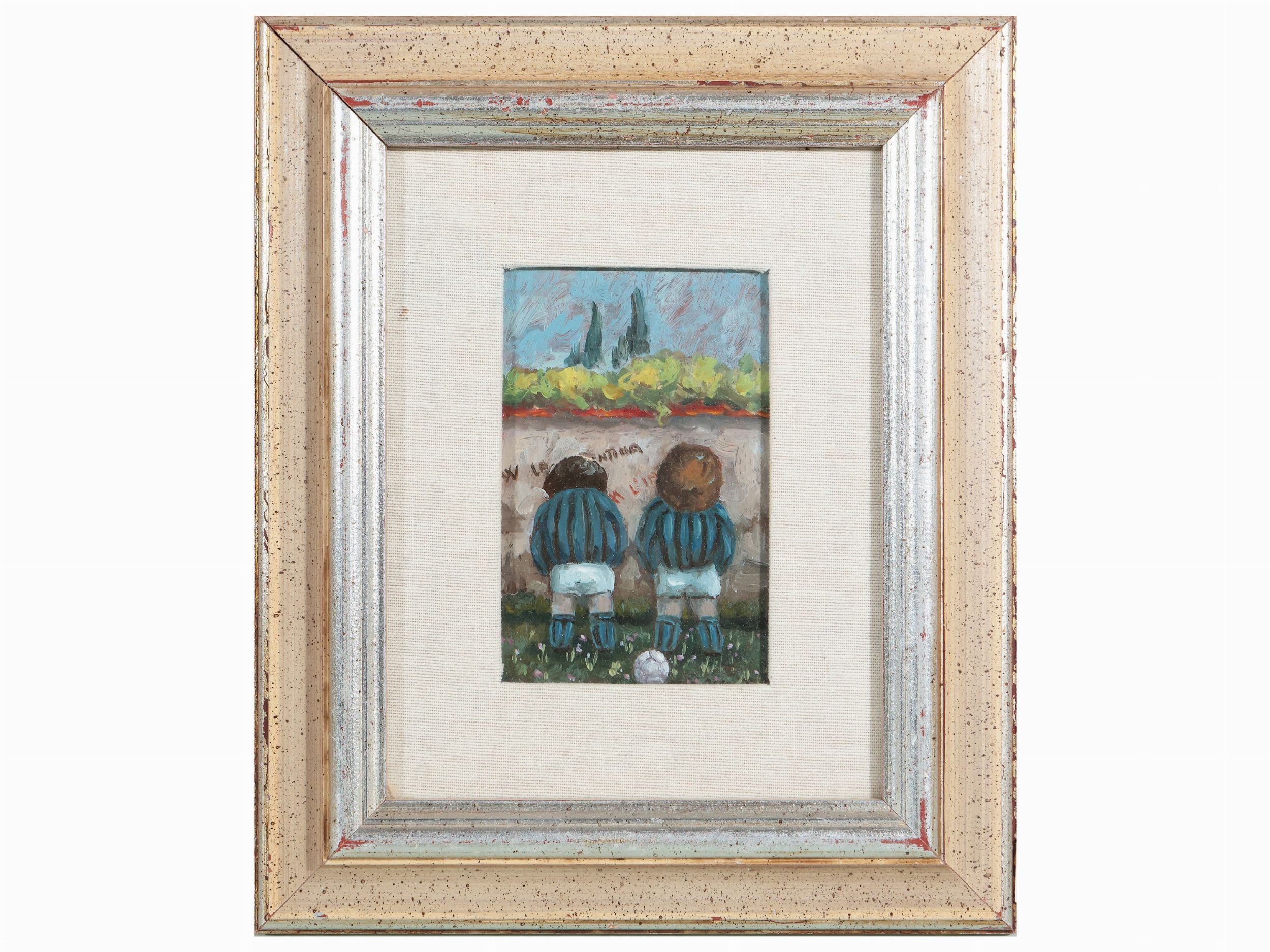 XX secolo raffiguranti Bambine sedute con pallone e Piccoli calciatori, olio su tavoletta, firmati, in cornice