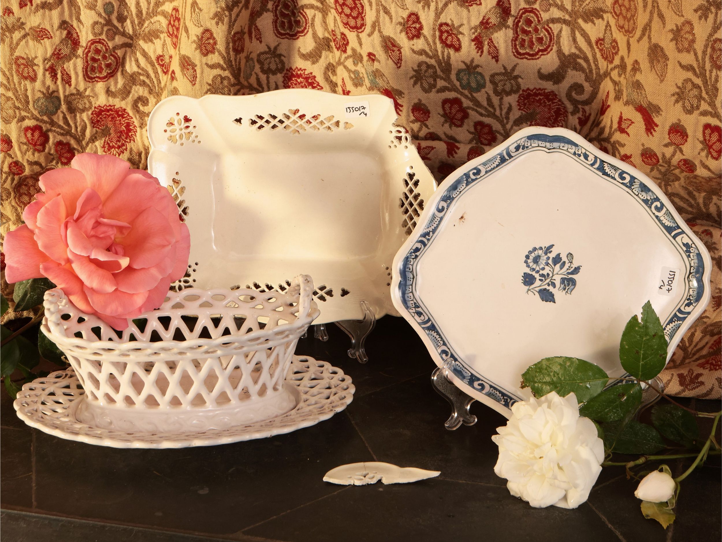 cestino h cm 10x22x14 (4) XVIII/XIX secolo composto da un cestino ovale realizzato come un intreccio di paglia a grata con il suo vassoietto, un piatto di forma quadrata dipinto in monocromia blu ed un vassoietto in terraglia con tesa a merletto (difetti)