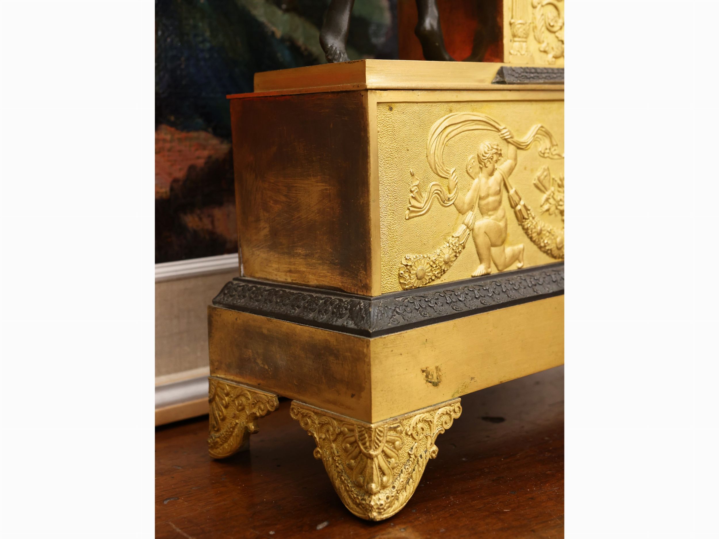 prima metà del XIX secolo sormontato da figura femminile allegorica, decorato con motivo a vaso, festoni e cherubini a bassorilievo, quadrante con numeri romani su base a plinto, corredato di chiave di carica, alcuni difetti