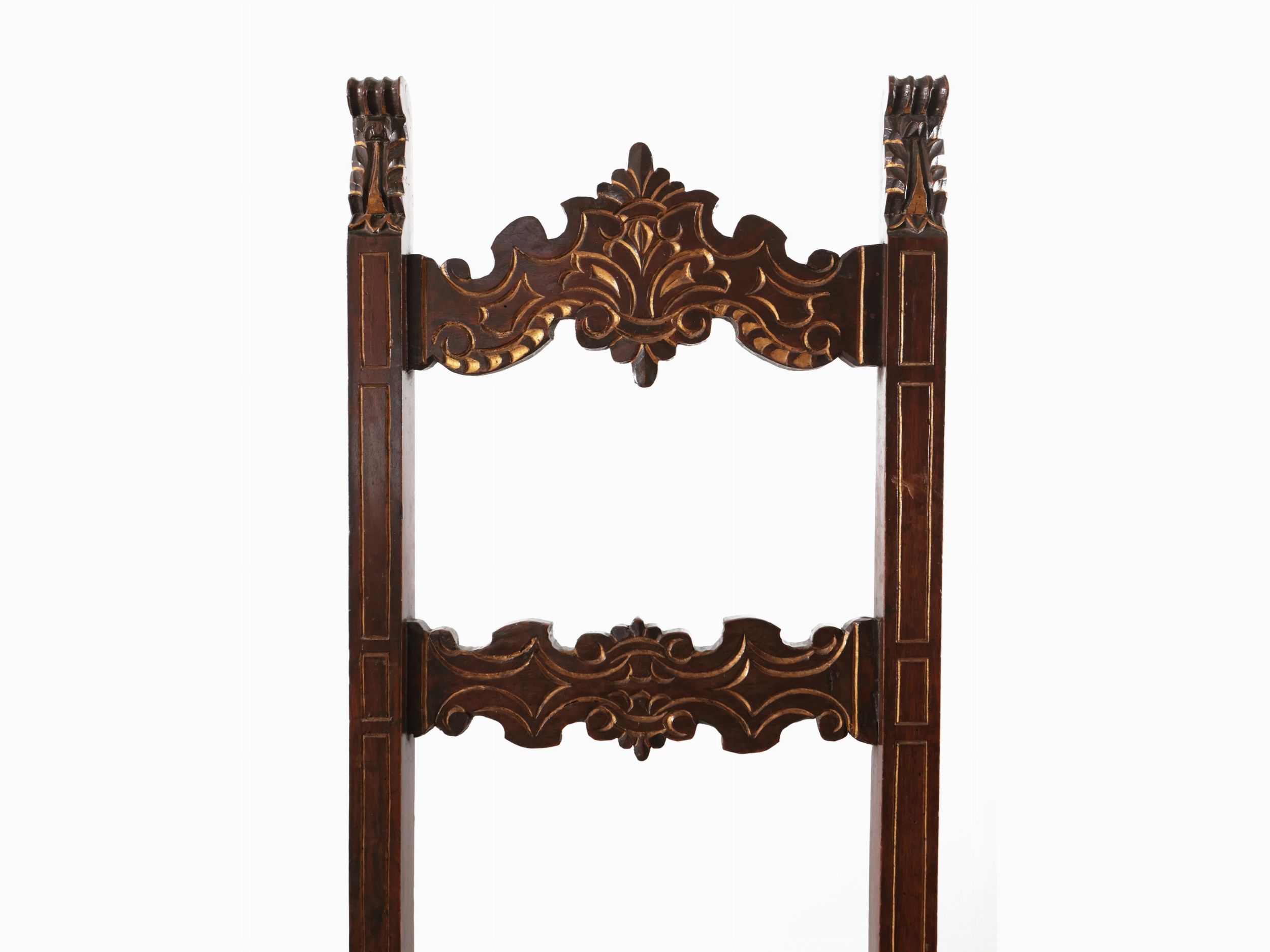 XVII secolo simili tra loro, schienali con doppia cartella intagliata e dorata con motivo a volute, sedili imbottiti e rivestiti in pelle decorata da borchie in ferro, gambe tornite, alcuni difetti