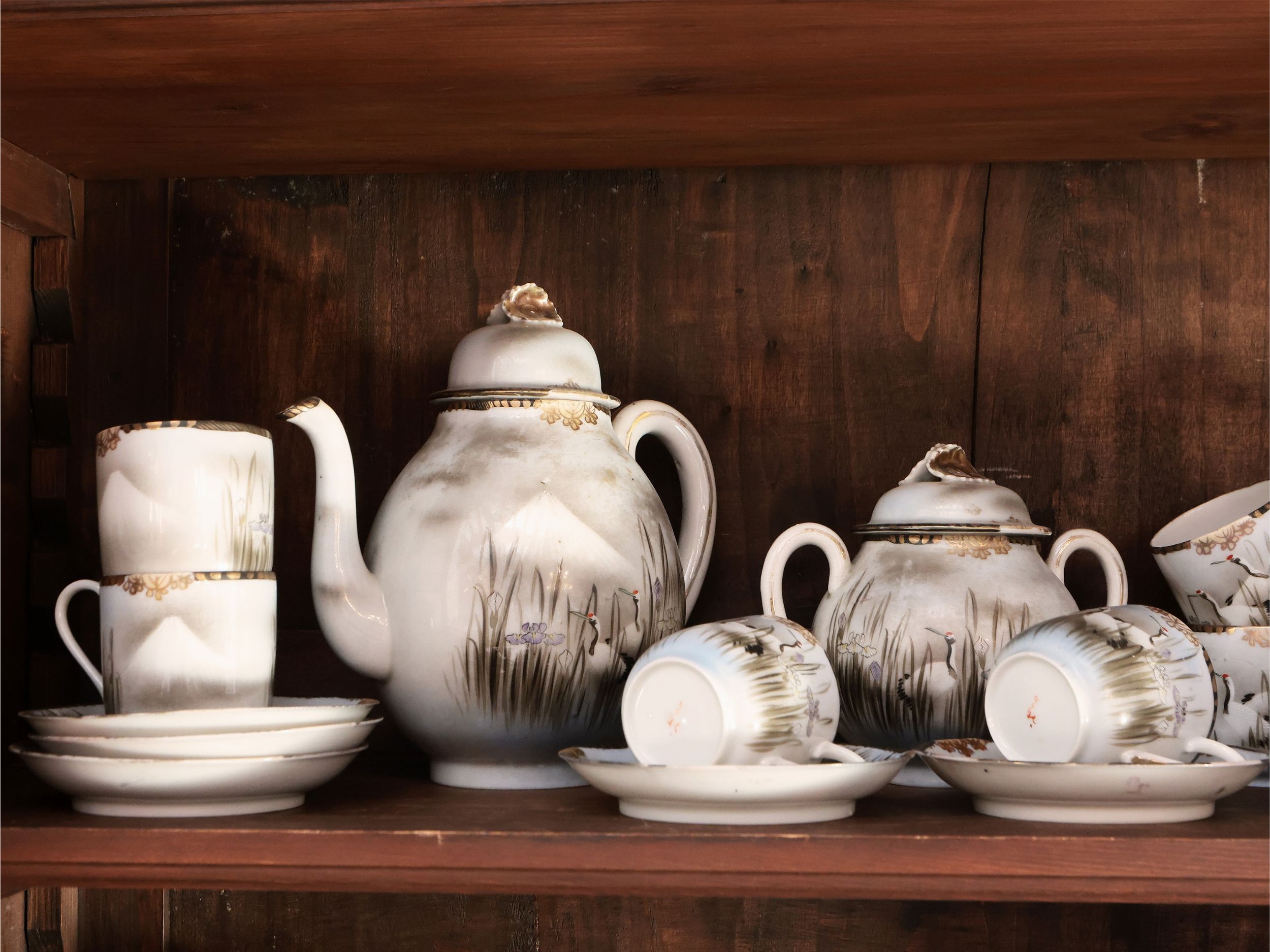 Giappone, prima metà del XX secolo dipinto con cicogne in paesaggio lacustre con sfondo del Fujiyama, composto da caffettiera, due lattiere e dieci tazzine con otto piattini, alcuni difetti