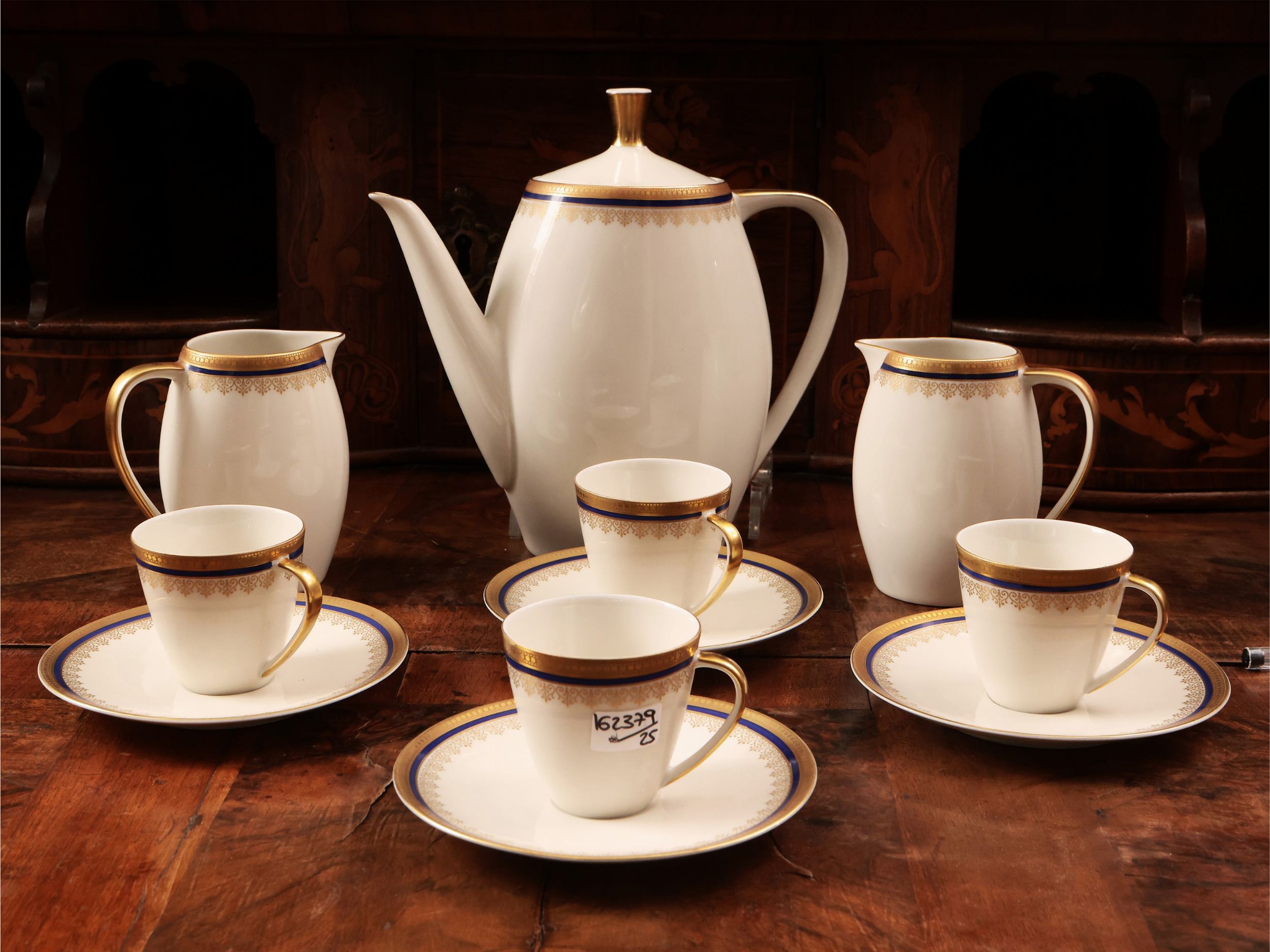 h da cm 10 a cm 21 (25) XX secolo decorato con bordo profilato in blu cobalto e motivo floreale lumeggiato in oro, composto da caffettiera, coppia di lattiere, serie di 12 tazze da tè corredate da piattino e serie di 8 tazzine da caffè corredate da piattino (con due piattini di riserva)