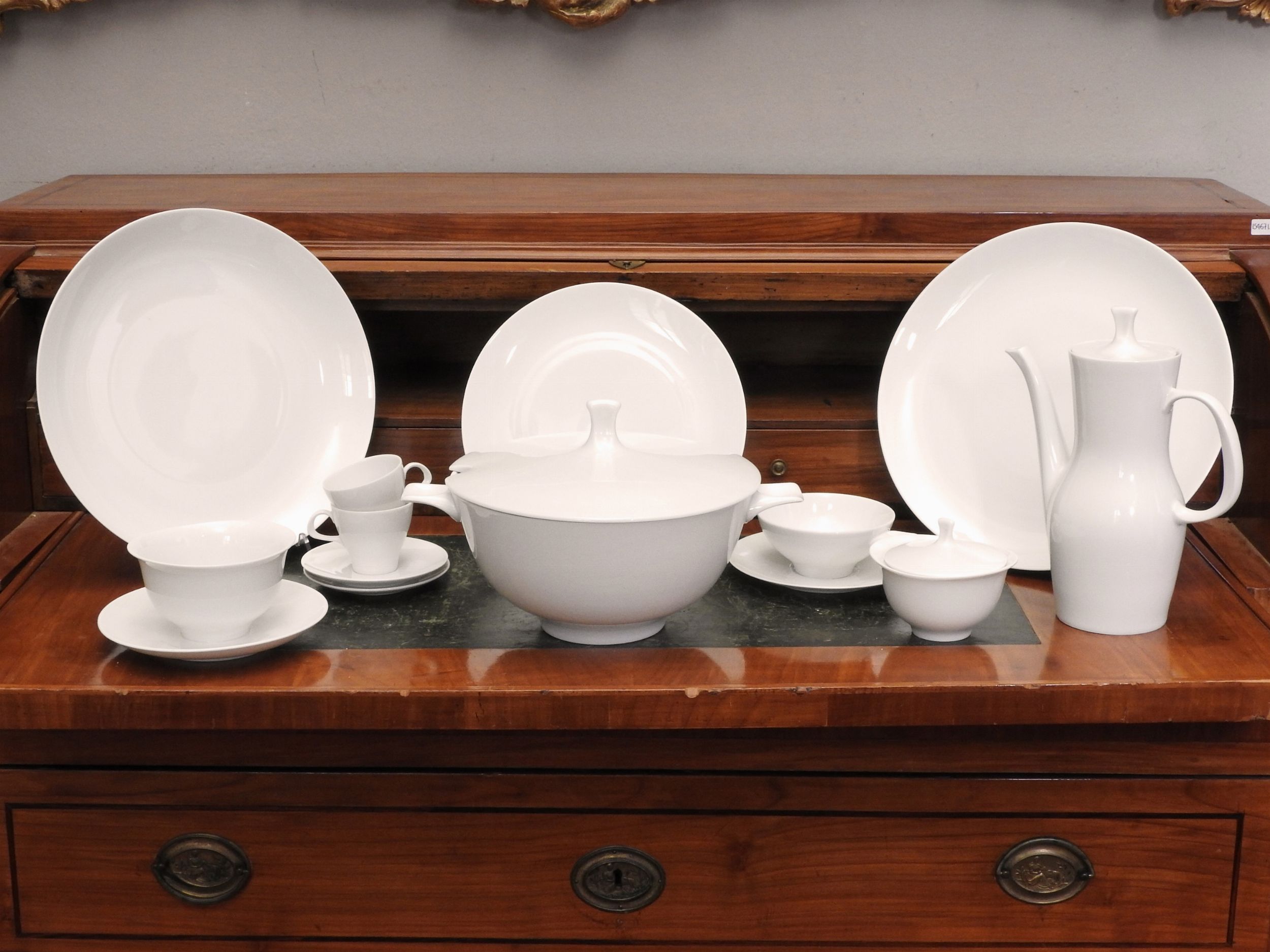 Anni Sessanta completo per otto persone, composto da 9 piatti piani, 9 fondi, 9 piattini, zuppiera, 2 vassoi ovali a scalare e due rotondi, 2 raviere, una salsiera, caffettiera, zuccheriera, 9 tazzine da caffè con piattini, 9 da tè con piattini, alcuni pezzi di riserva (54)