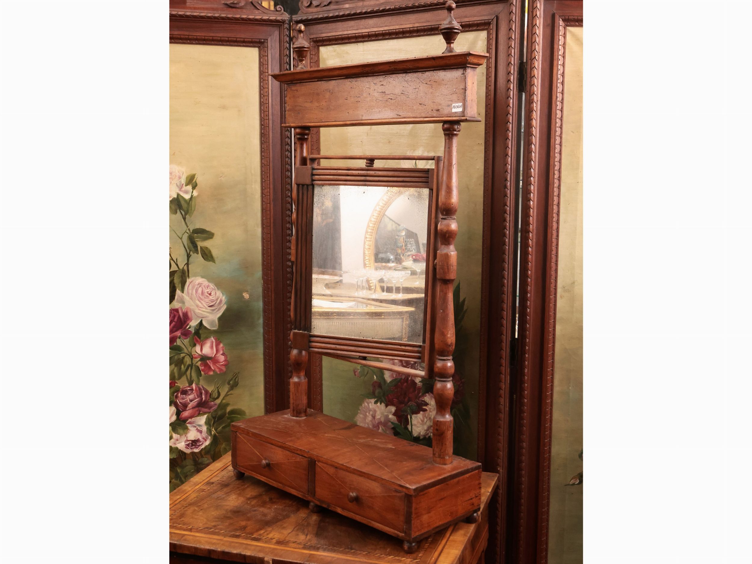 metà del XIX secolo specchio orientabile, montanti torniti con finali a pinnacolo, due cassettini nella fascia, alcuni difetti