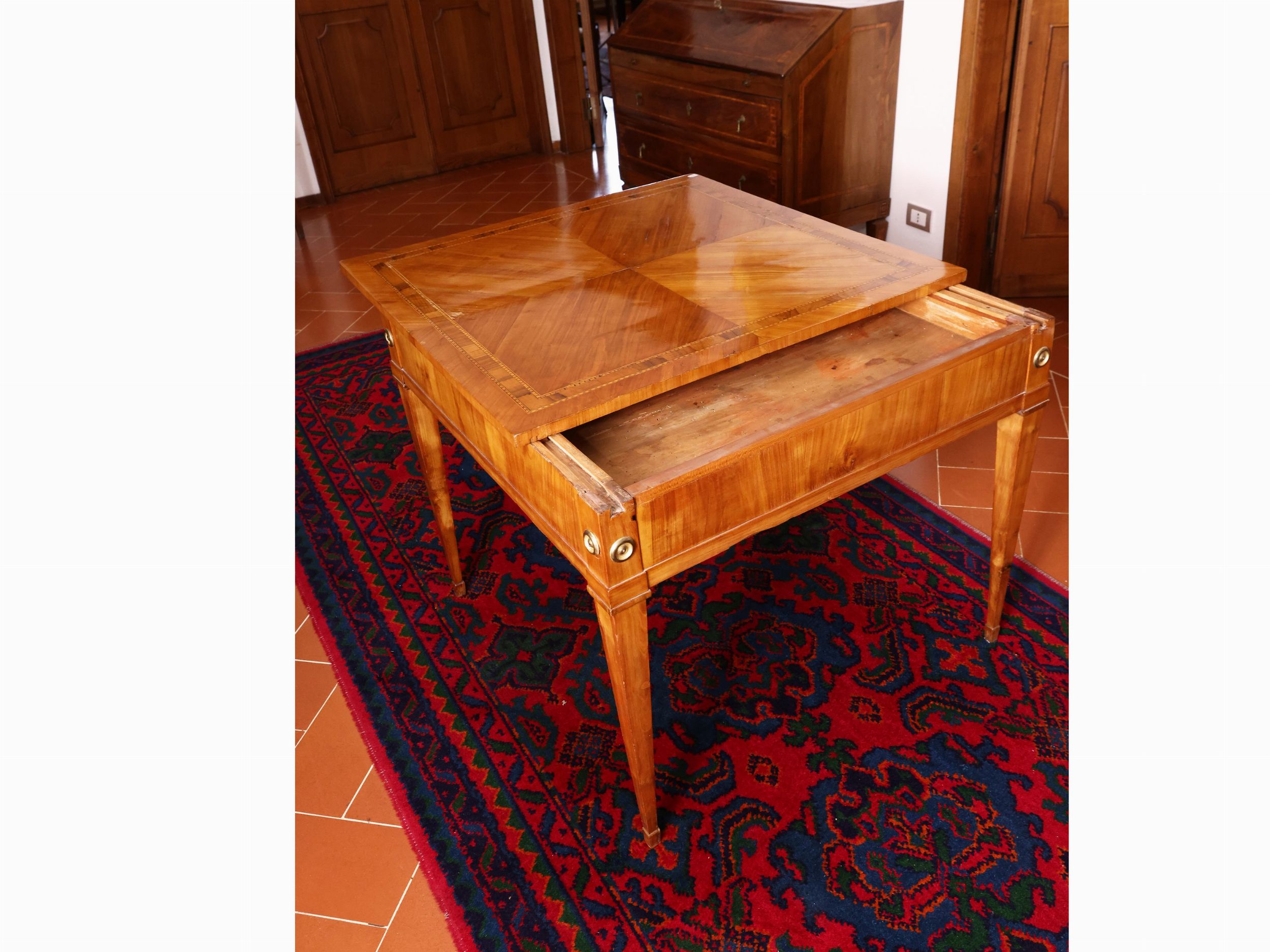 h cm 71x85x85 Toscana, fine del XVIII secolo piano di forma quadrata, intarsiato con doppia filettatura a nastro ed a piccoli motivi romboidali, che scorre nei due sensi a celare tre vani disposti verticalmente ed uno in orizzontale, gambe a faretra con applicazione di borchie in bronzo dorato, piedini a dado