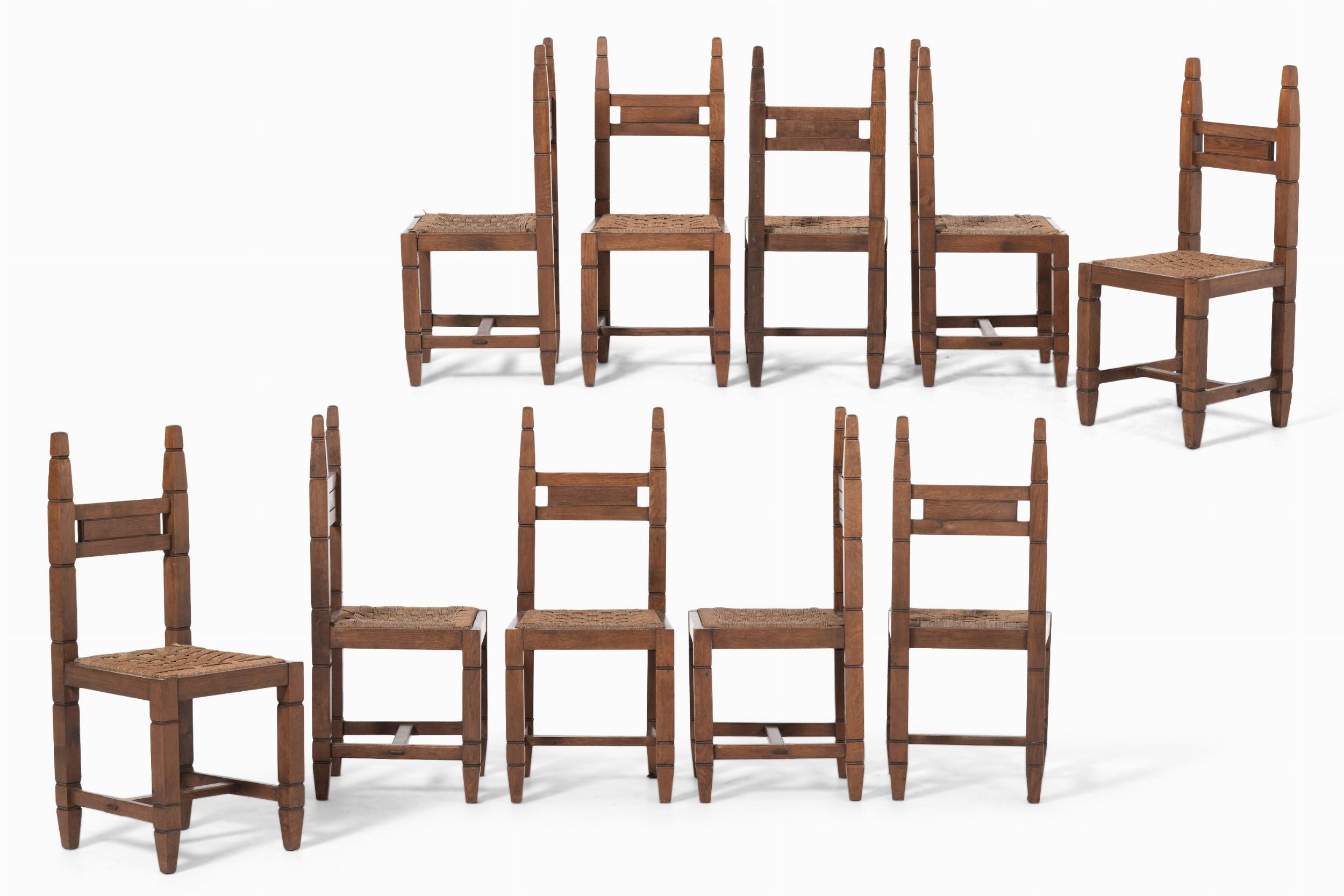 Dieci sedie. Struttura in legno e seduta in paglia.