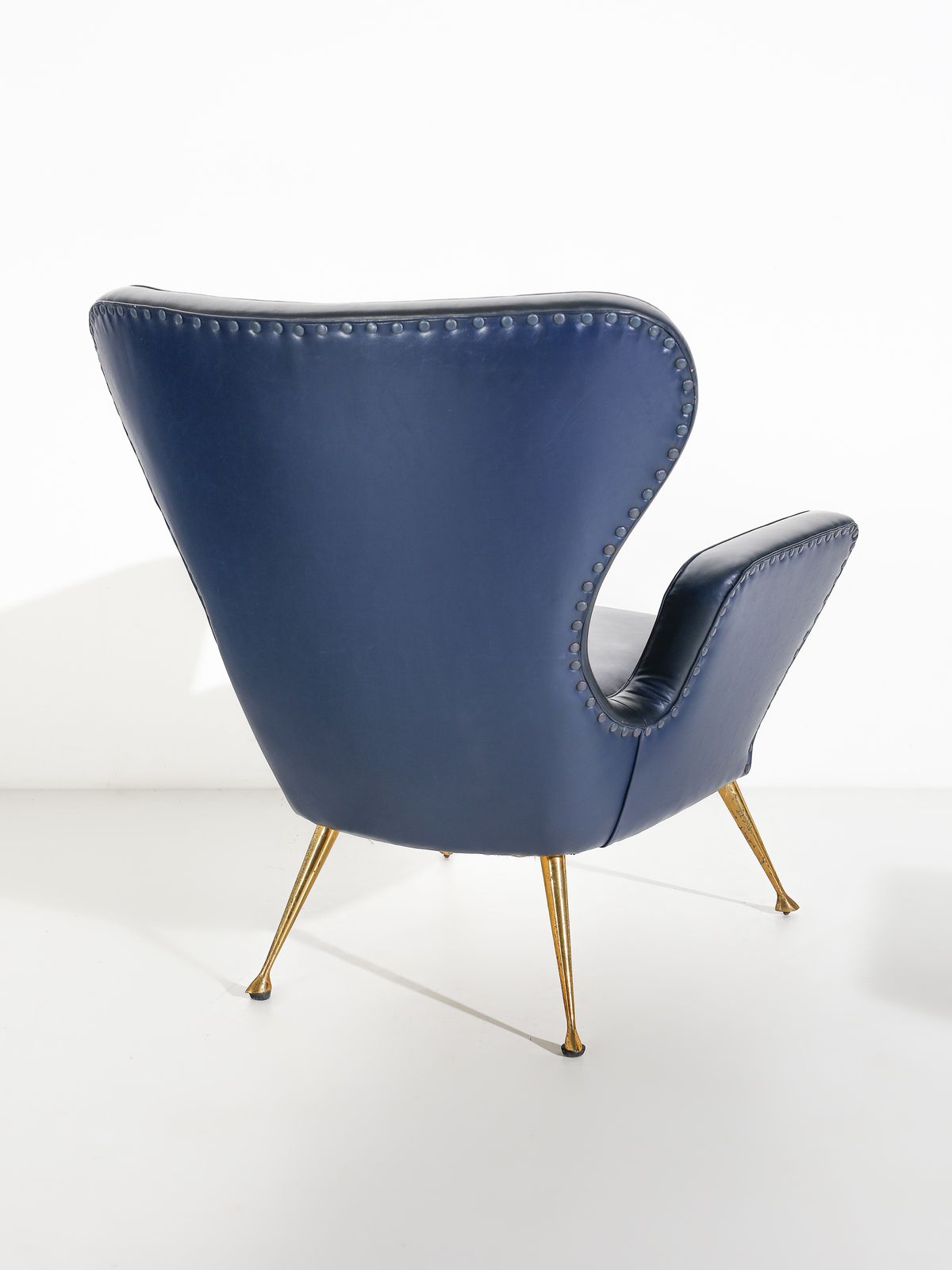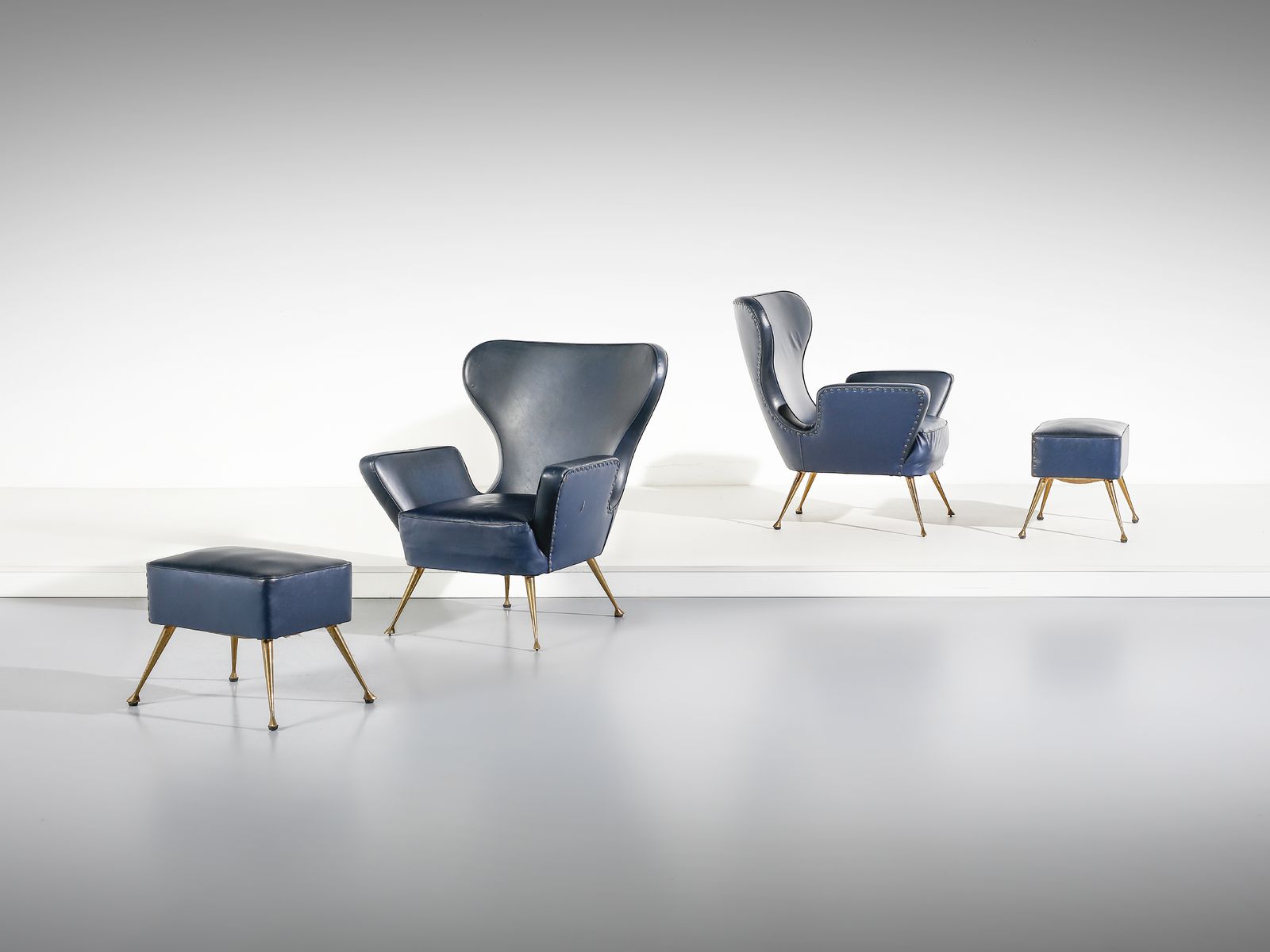 Anni Sessanta.Dimensioni: poltrone 80 x 70 x 67 cm. poggiapiedi 40 x 43 x 32 cm