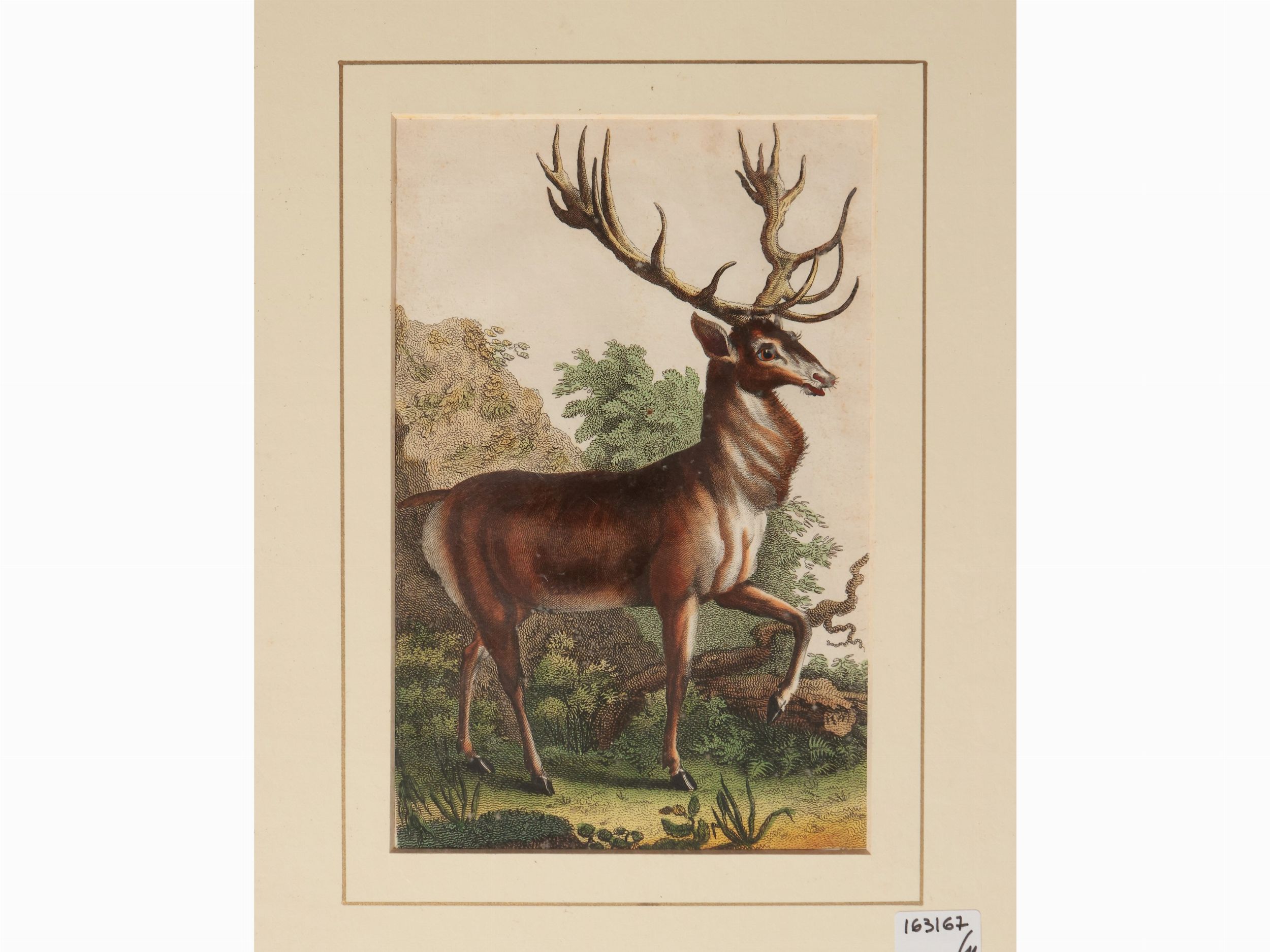 XIX secolo una acquatinta con scoiattoli, 10 cromolitografie (raffiguranti tra gli altri un cervo, una colomba, suini e uccelli), tutte con passe-partout, lievi tracce di foxing