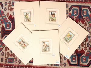 figurine cm 10,5x7, passe-partout cm 35x27,5 (5) Inizio del XX secolo cinque cromolitografie pubblicitarie, con [..]