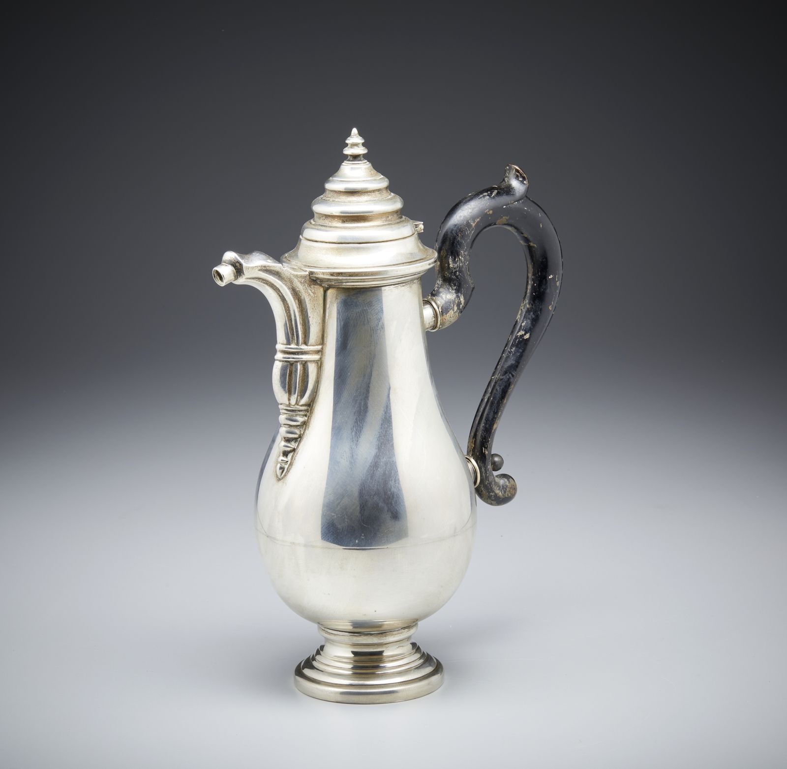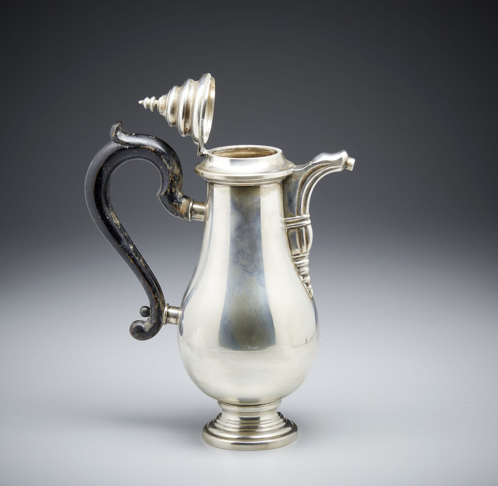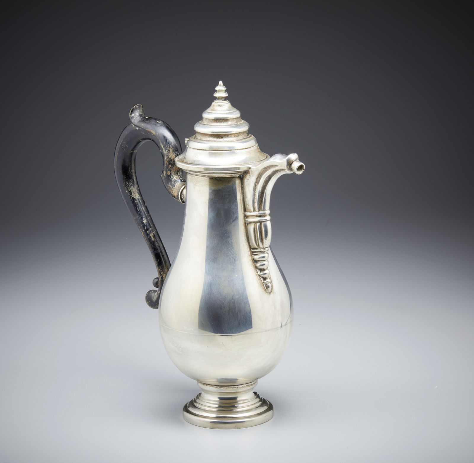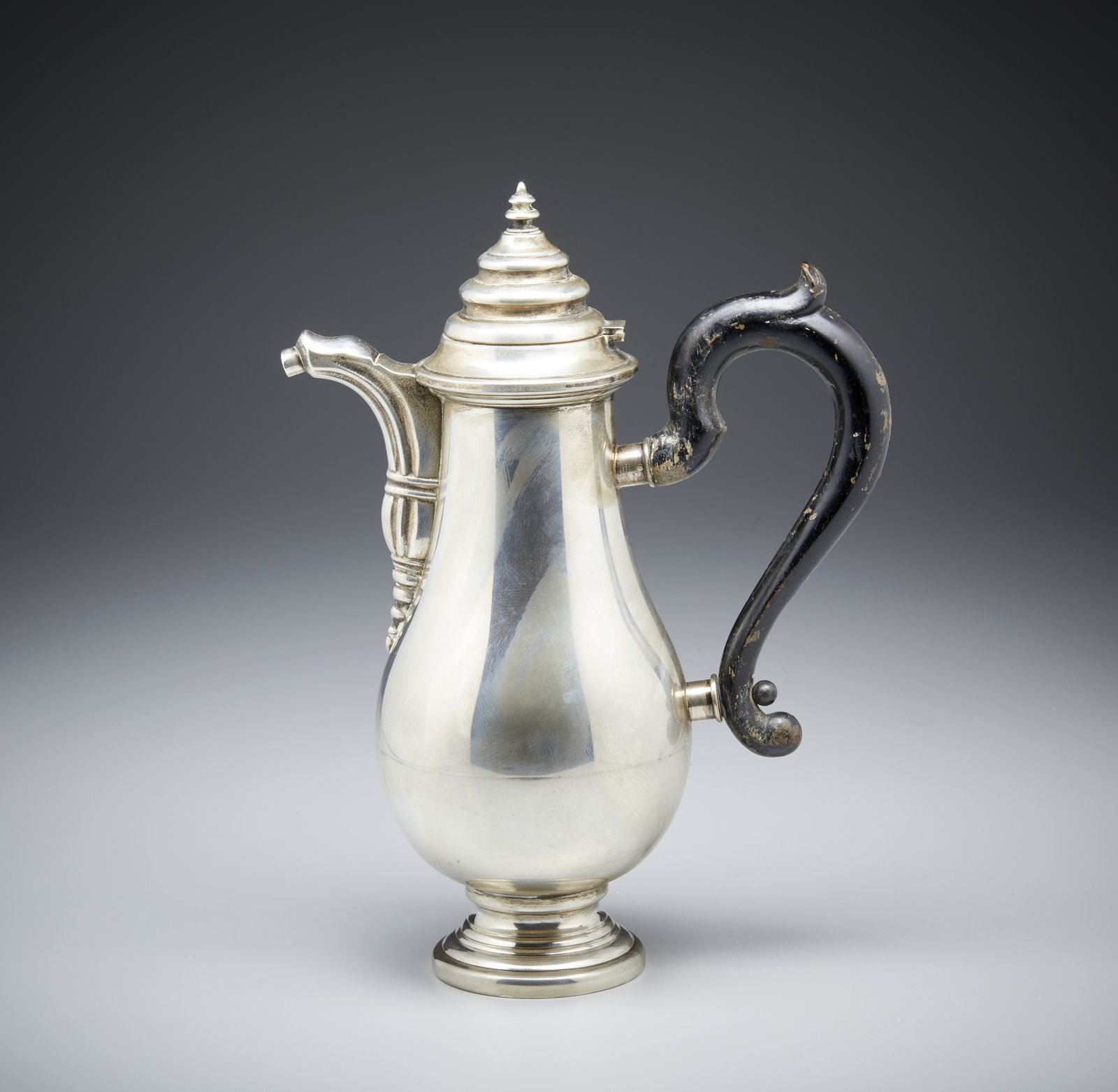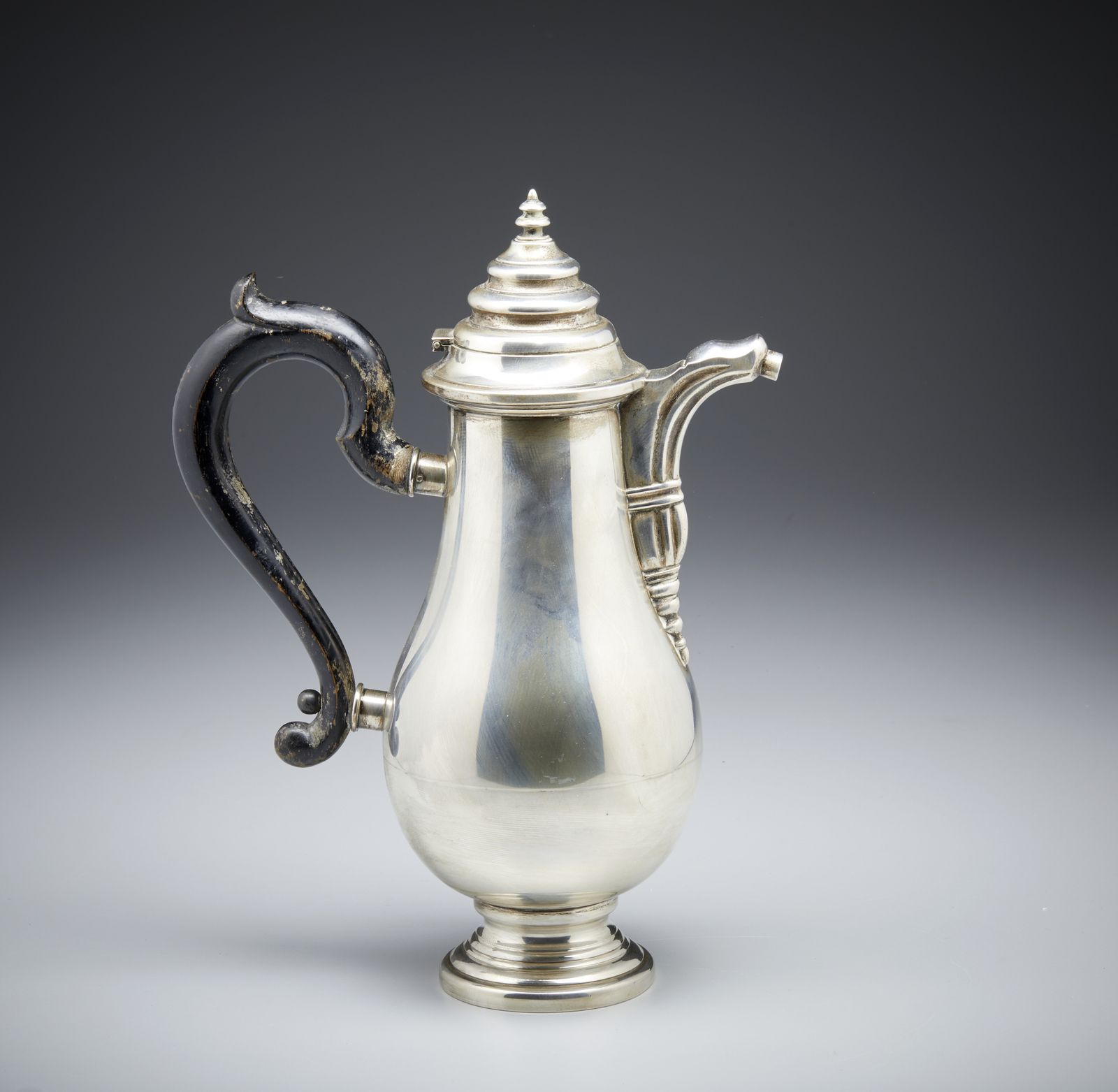 Caffettiera in argento, corpo piriforme e piede circolare, manico in legno