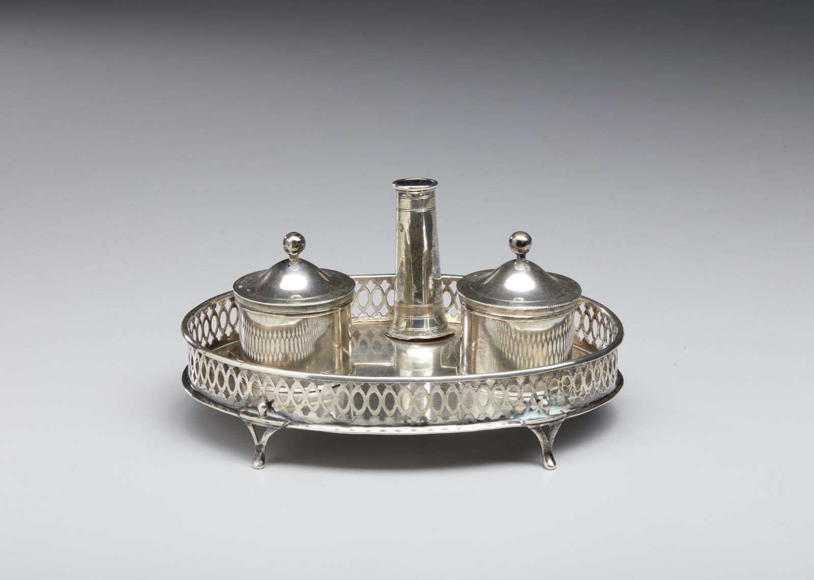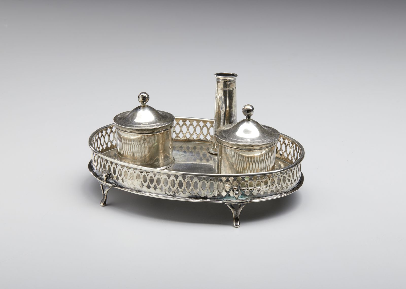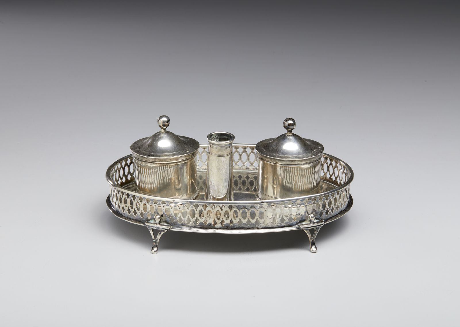 Calamaio in argento con vassoio ovale dal bordo rialzato e traforato