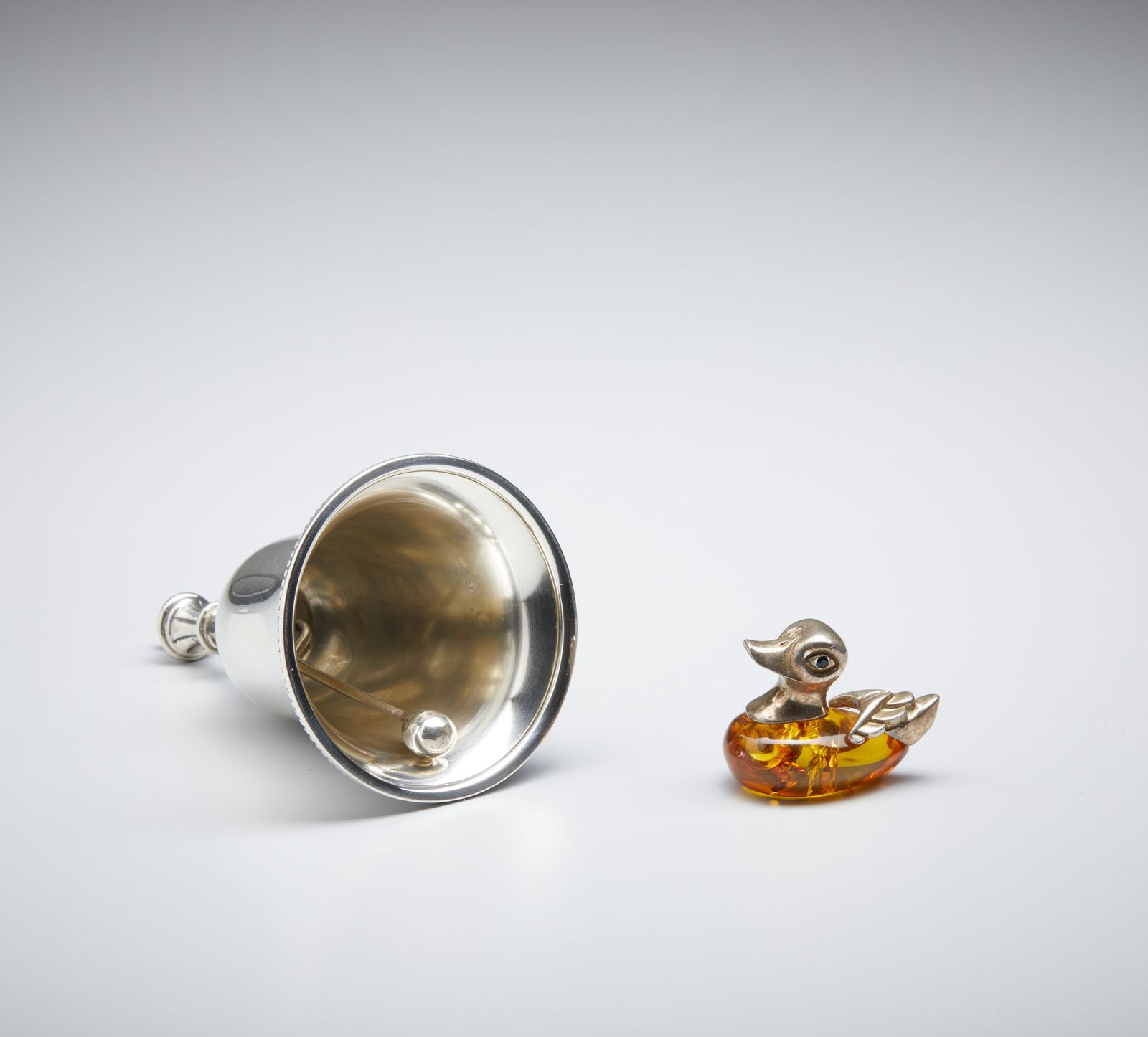 Titolo 800. Peso campanella: 0,052 kg. peso papera: 0,022 kg (ambra e argento).