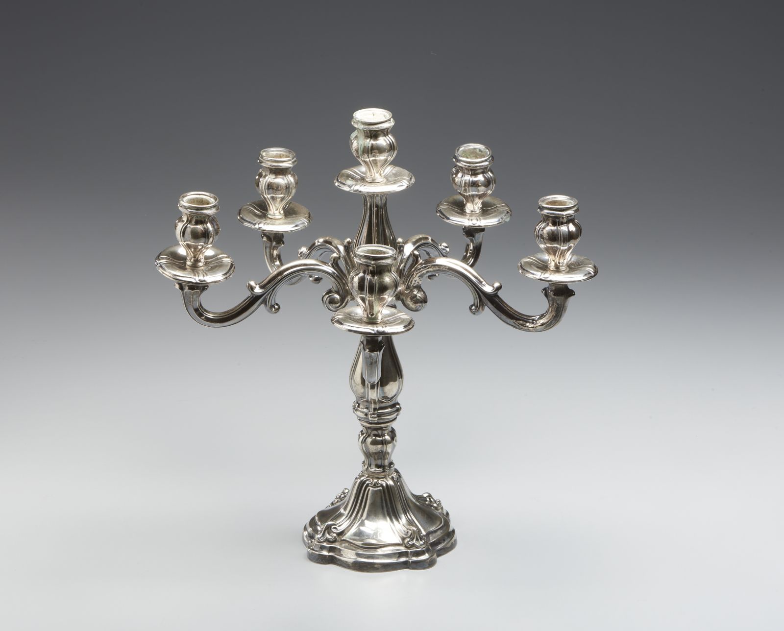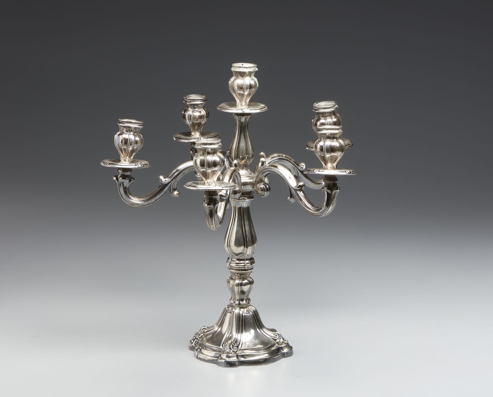Candelabro in argento a cinque luci, base e fusto sagomati con bracci a volute e [..]