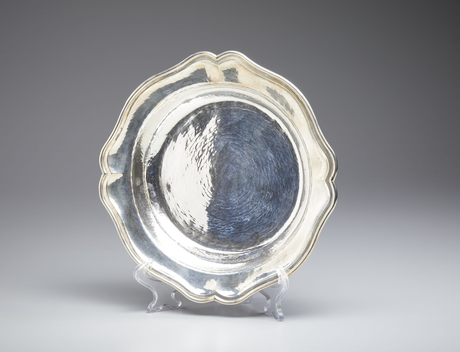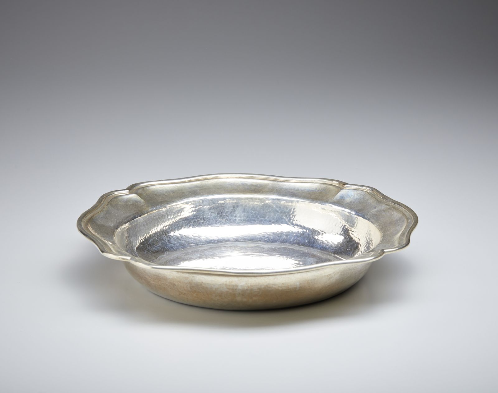 Centrotavola in argento sbalzato e martellato, bordo polilobato con profilo nerv [..]