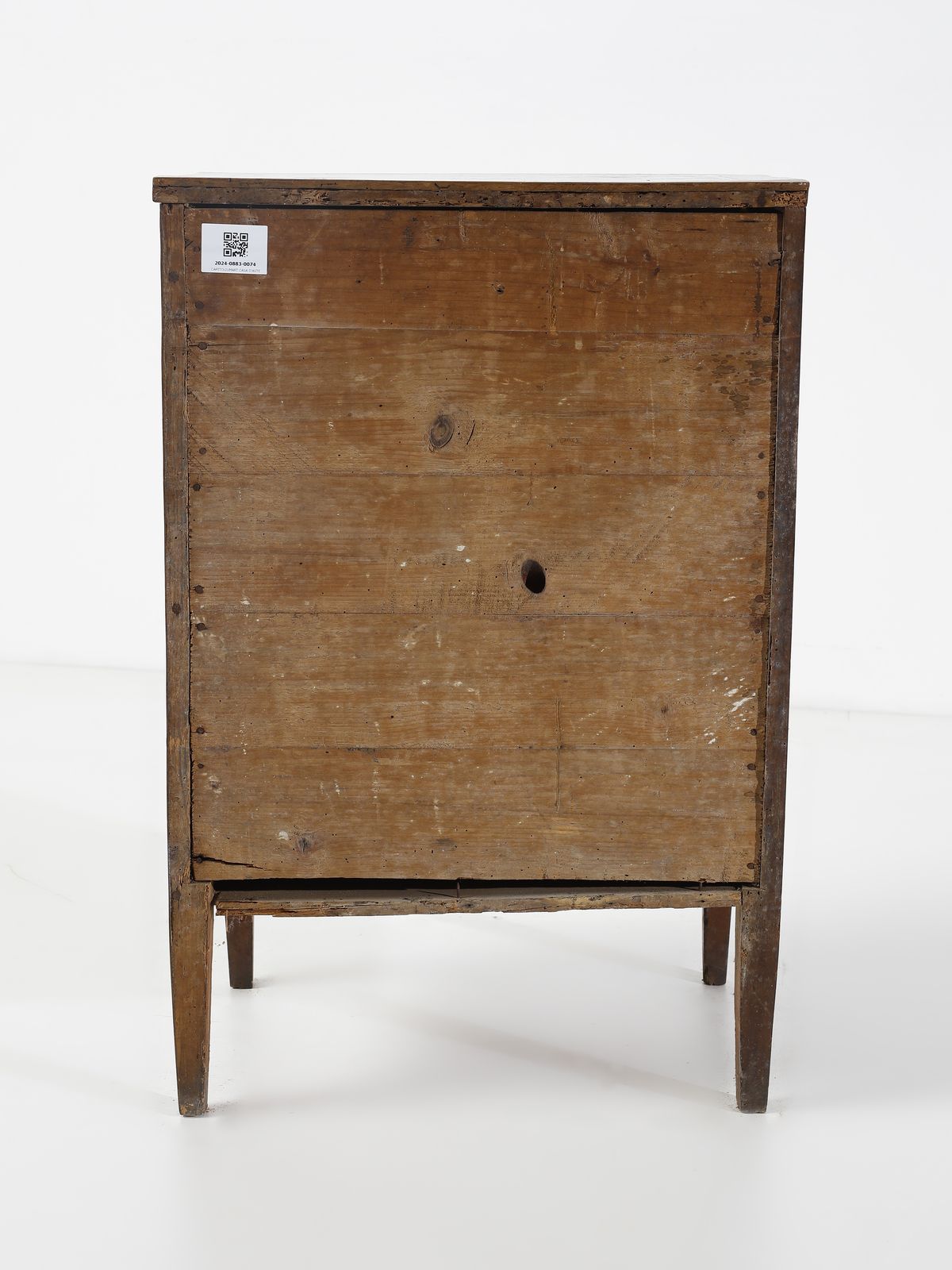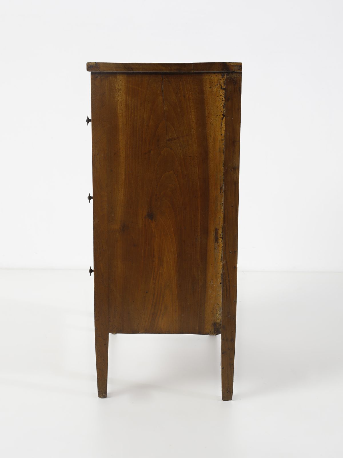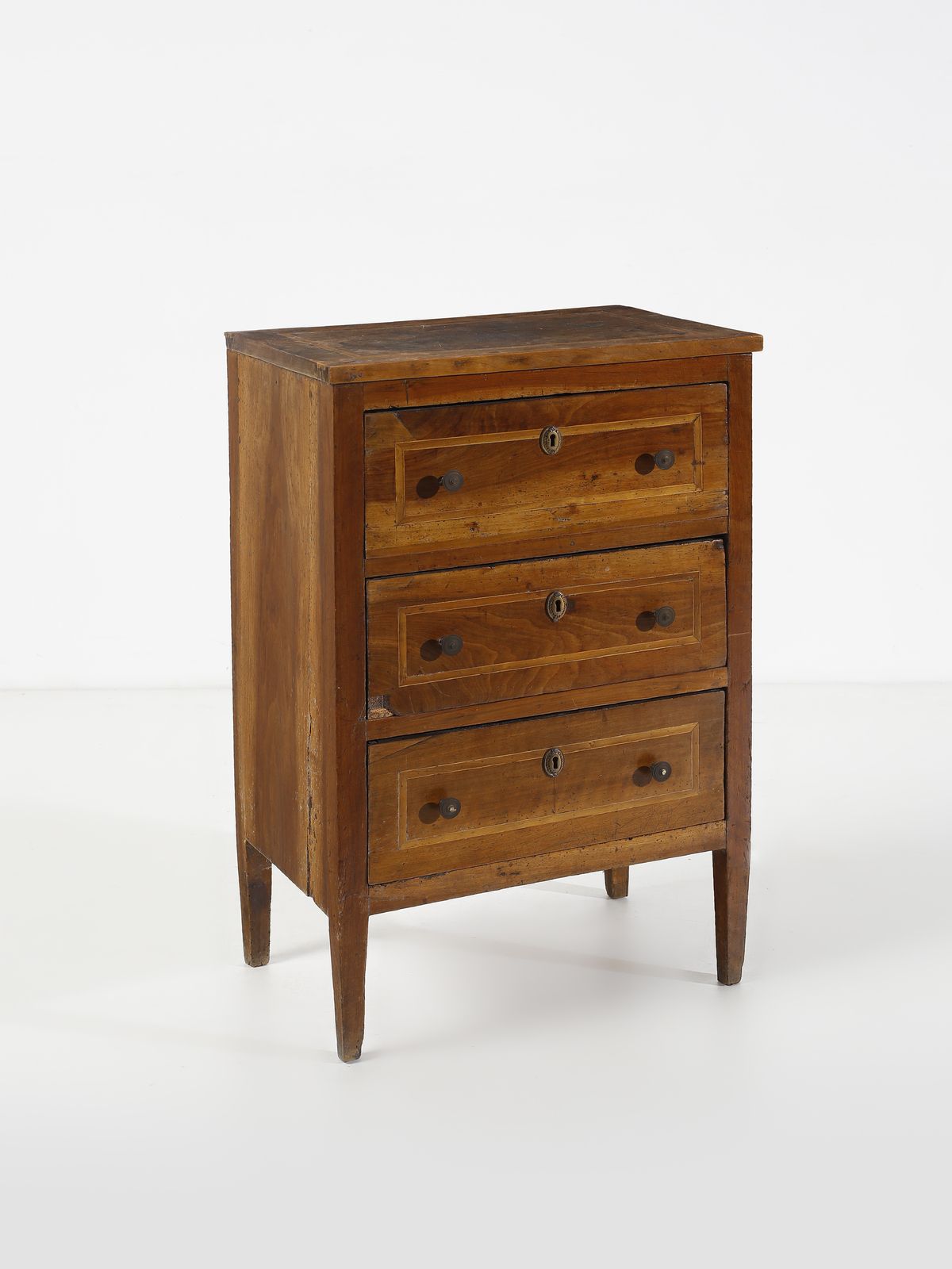 Comodino in noce, fronte e fianchi dritti, tre cassetti, gambe troncopiramidali