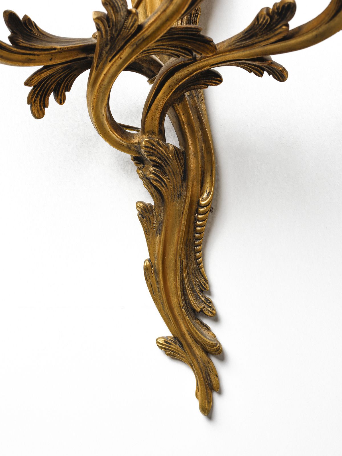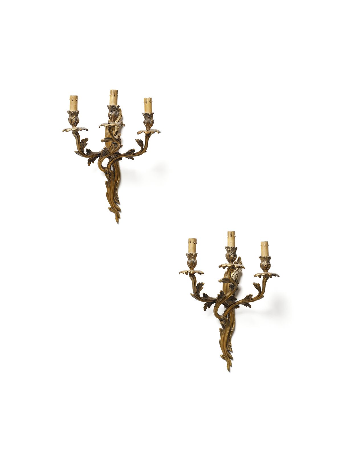 Coppia di appliques in stile Luigi XV a tre bracci in bronzo dorato, corpo e bracci [..]