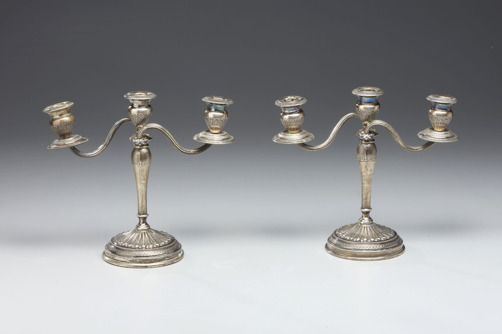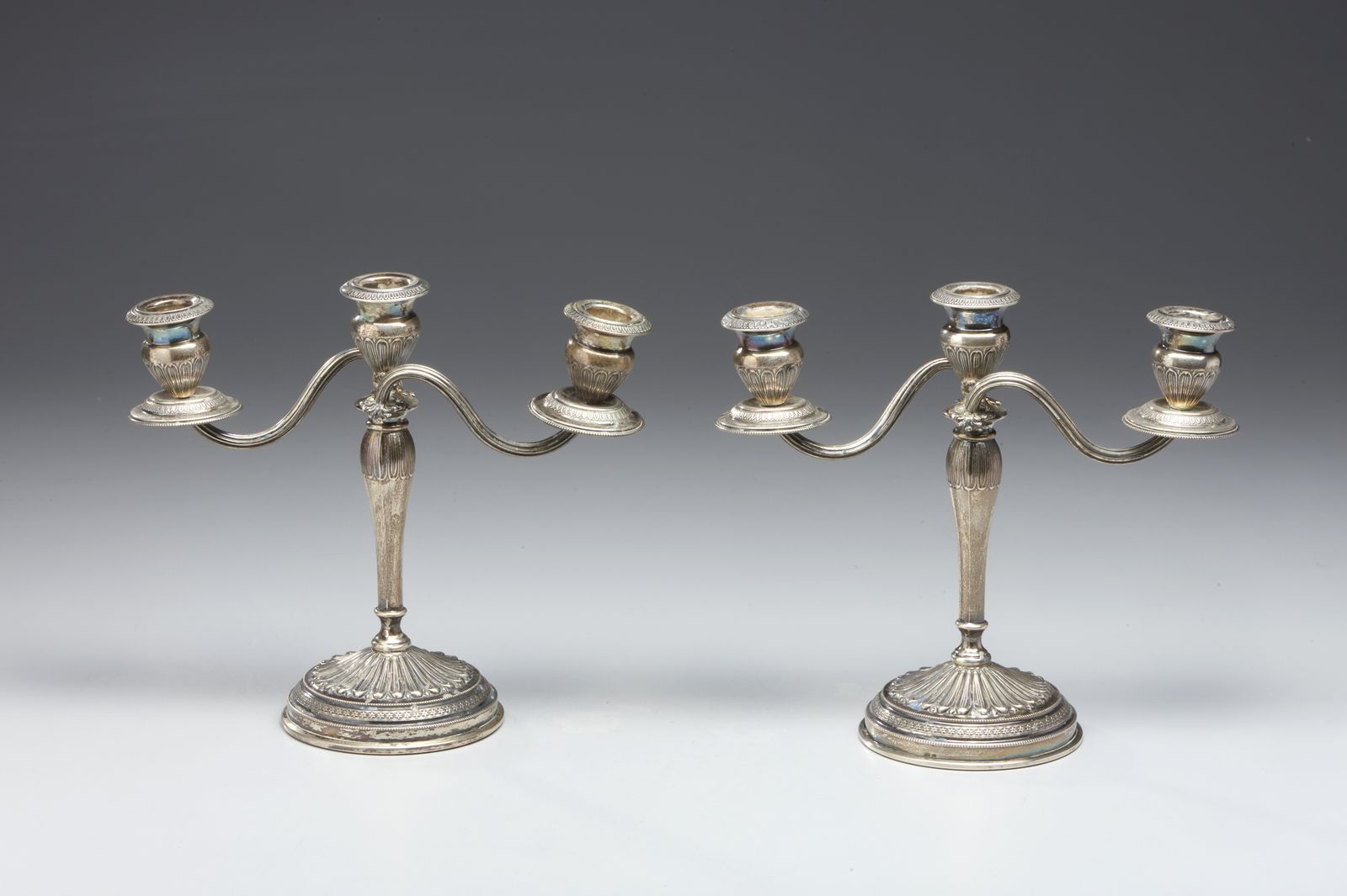 Coppia di candelabri a tre fiamme in argento sbalzato e cesellato, fusto conico [..]