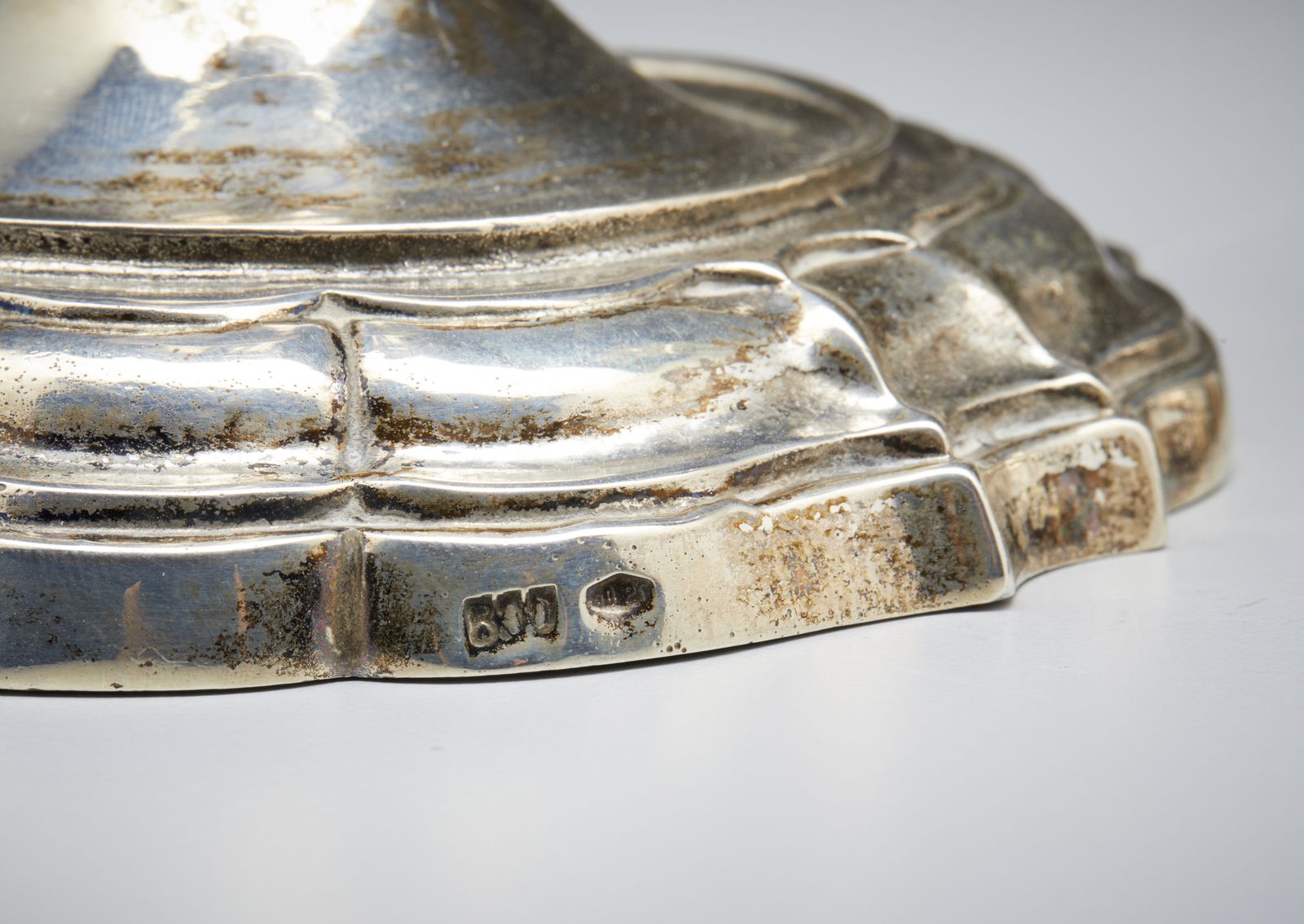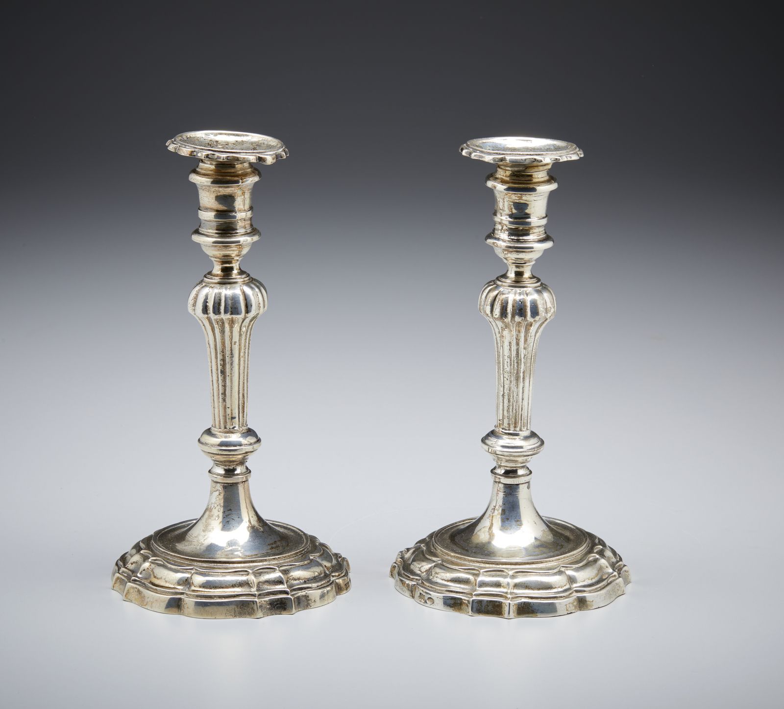 Coppia di candelieri in argento sbalzato e cesellato, piede sagomato e fusto a b [..]
