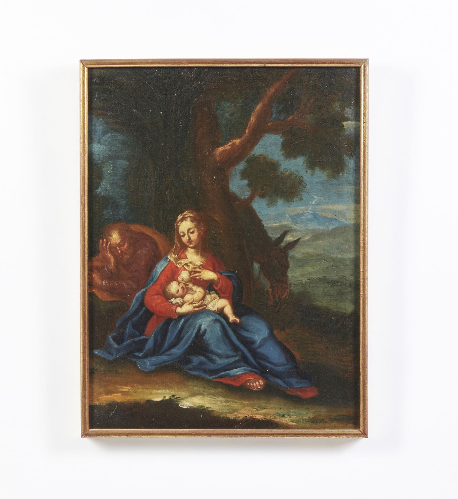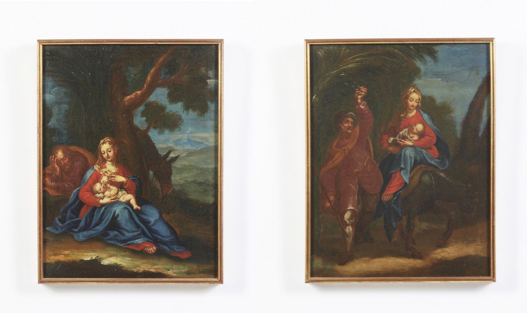 Coppia di dipinti raffiguranti fuga in Egitto riposo durante la fuga in Egitto