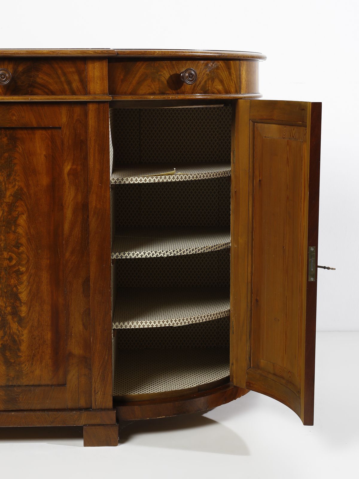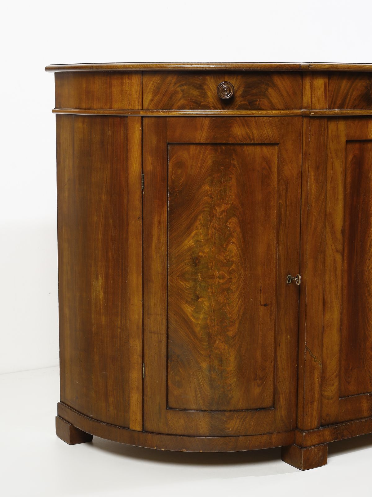 Credenza lastronata in mogano, fronte di linea curvata a quattro ante, sormontate [..]