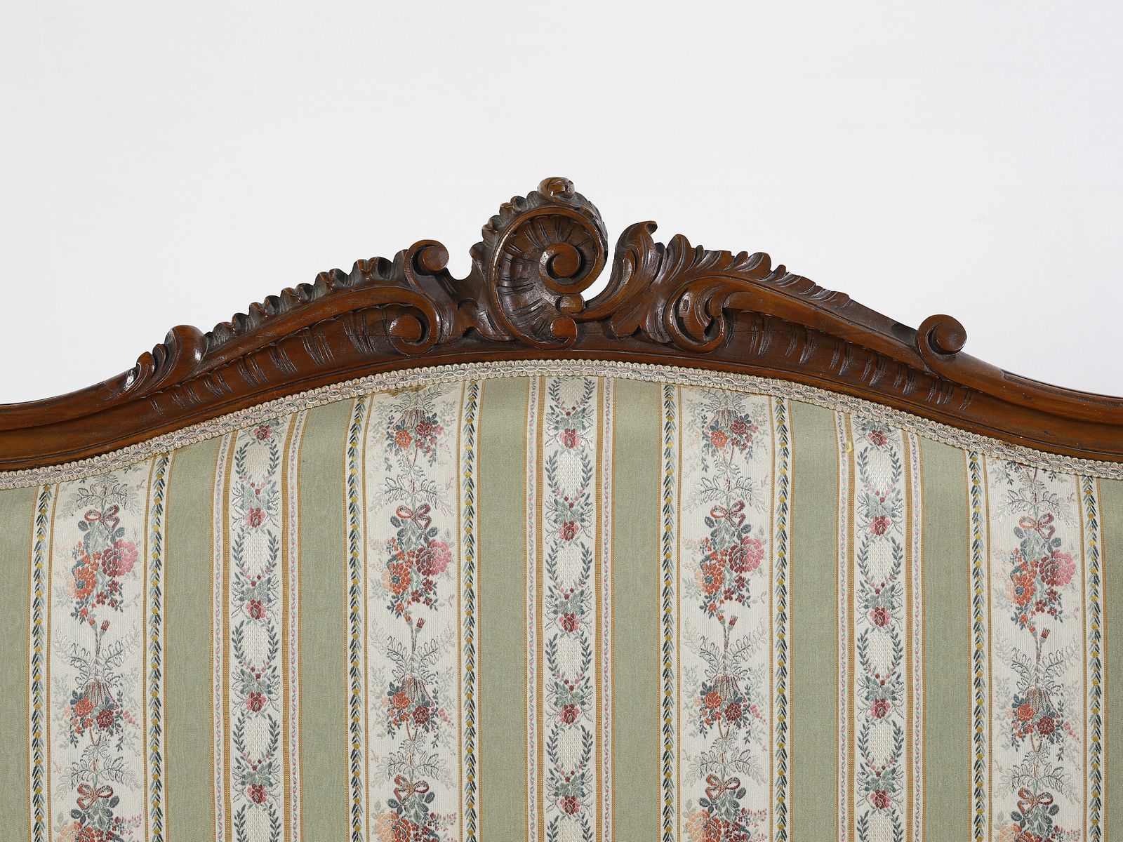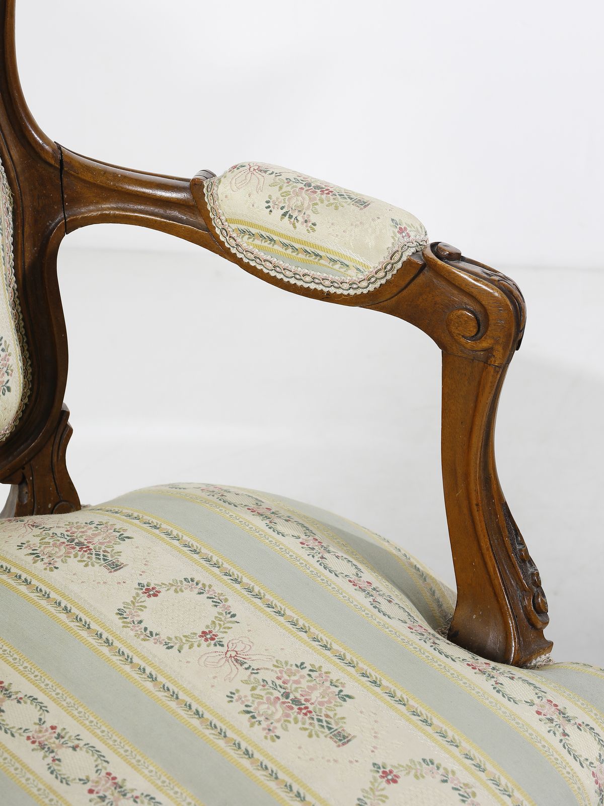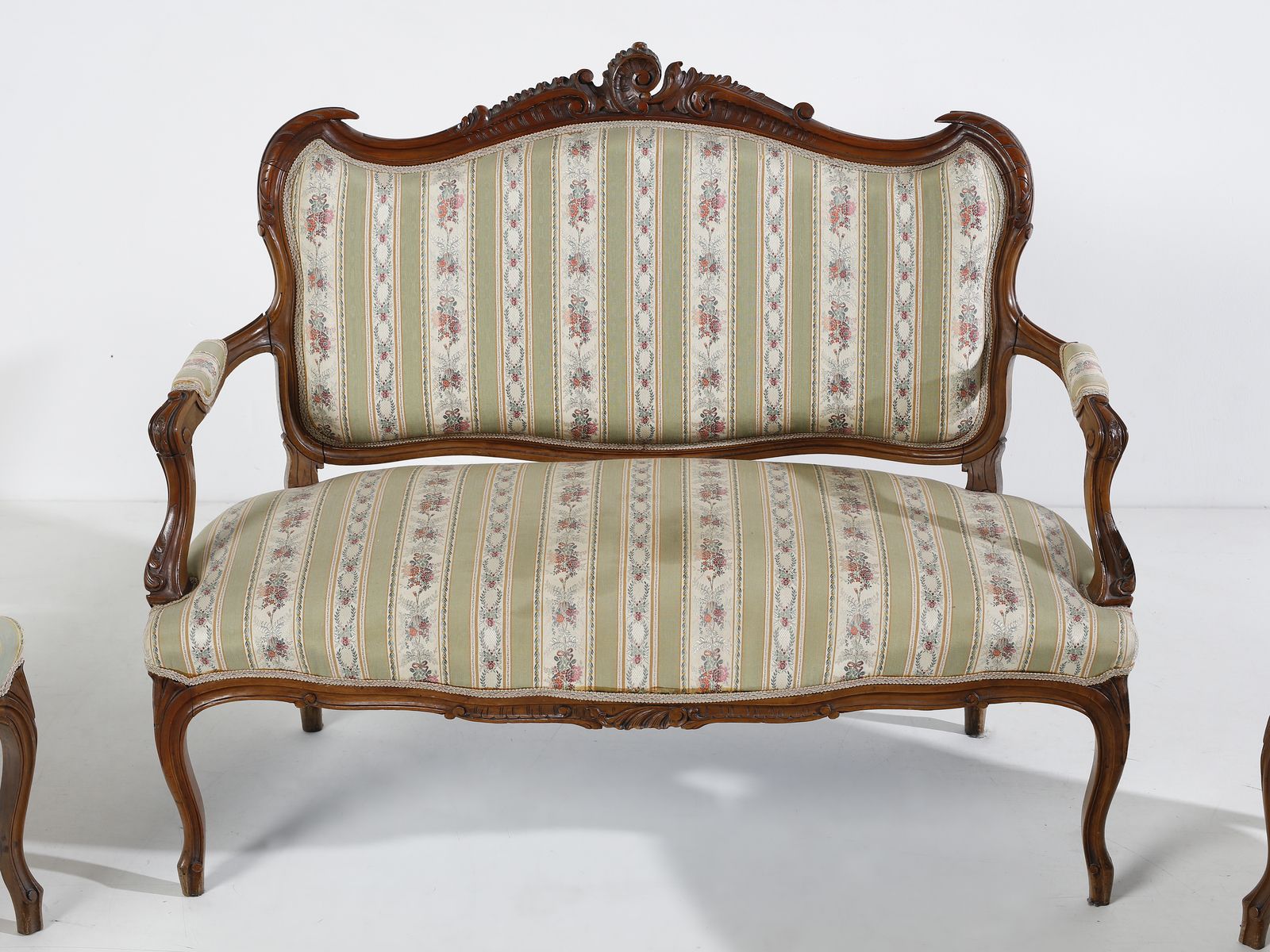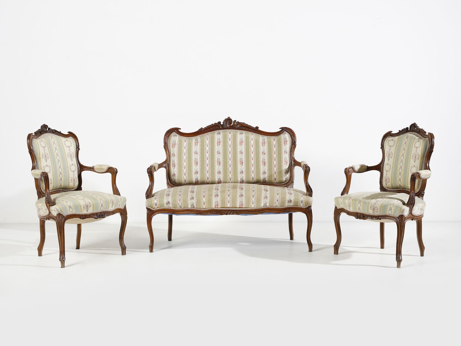 Divanetto e due poltrone in legno intagliato in stile settecentesco, schienali sormontati [..]