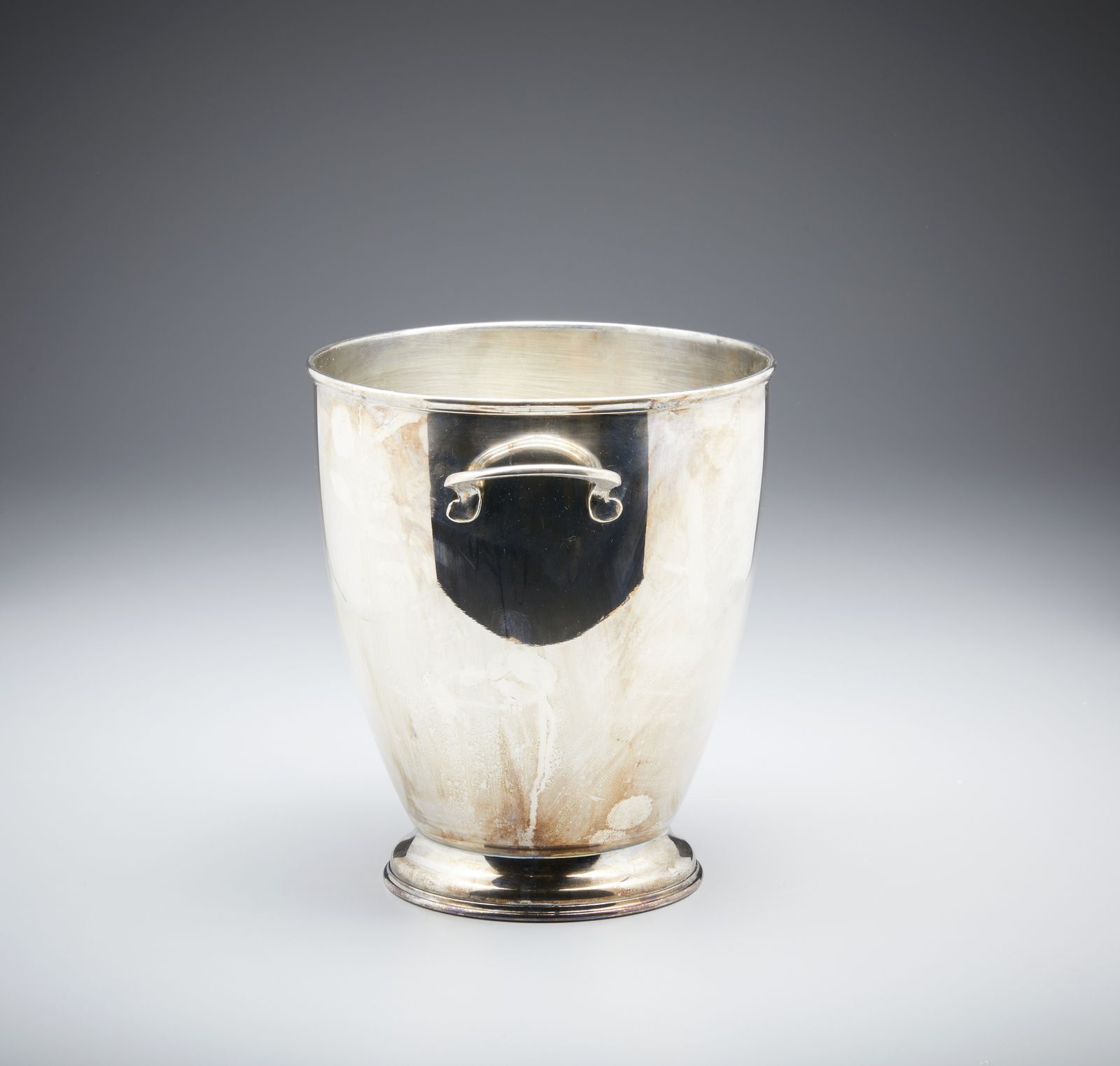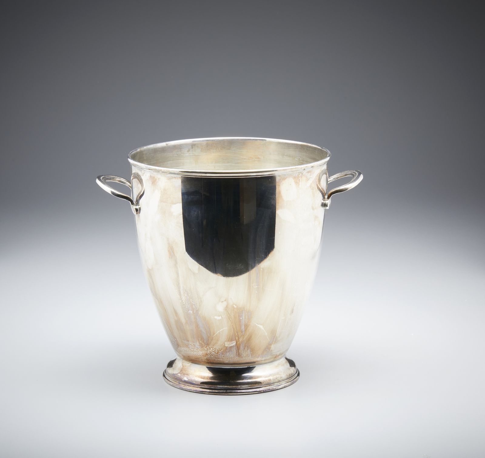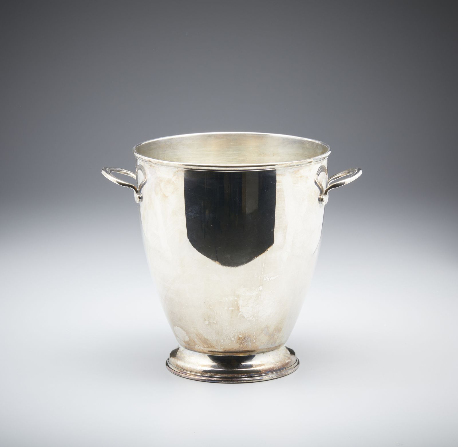 Secchiello portaghiaccio biansato in argento, corpo liscio poggiante su base cir [..]