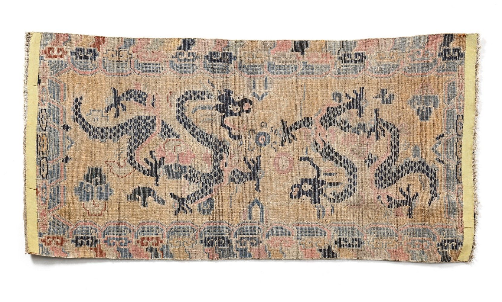 Tappeto con figure di draghi su campo chiaro, cornice esterna a nuvole ornamentali [..]