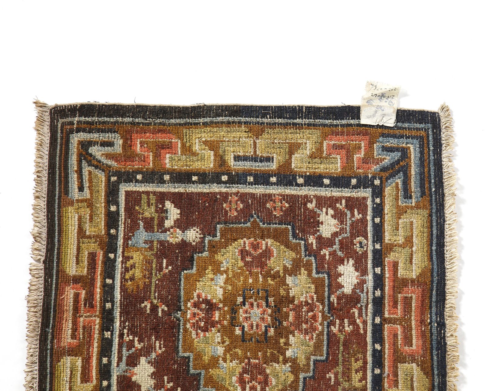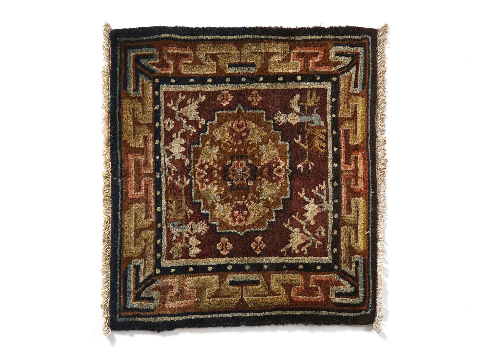 Tappeto di forma quadrata con medaglione centrale su fondo bruno con decorazioni [..]