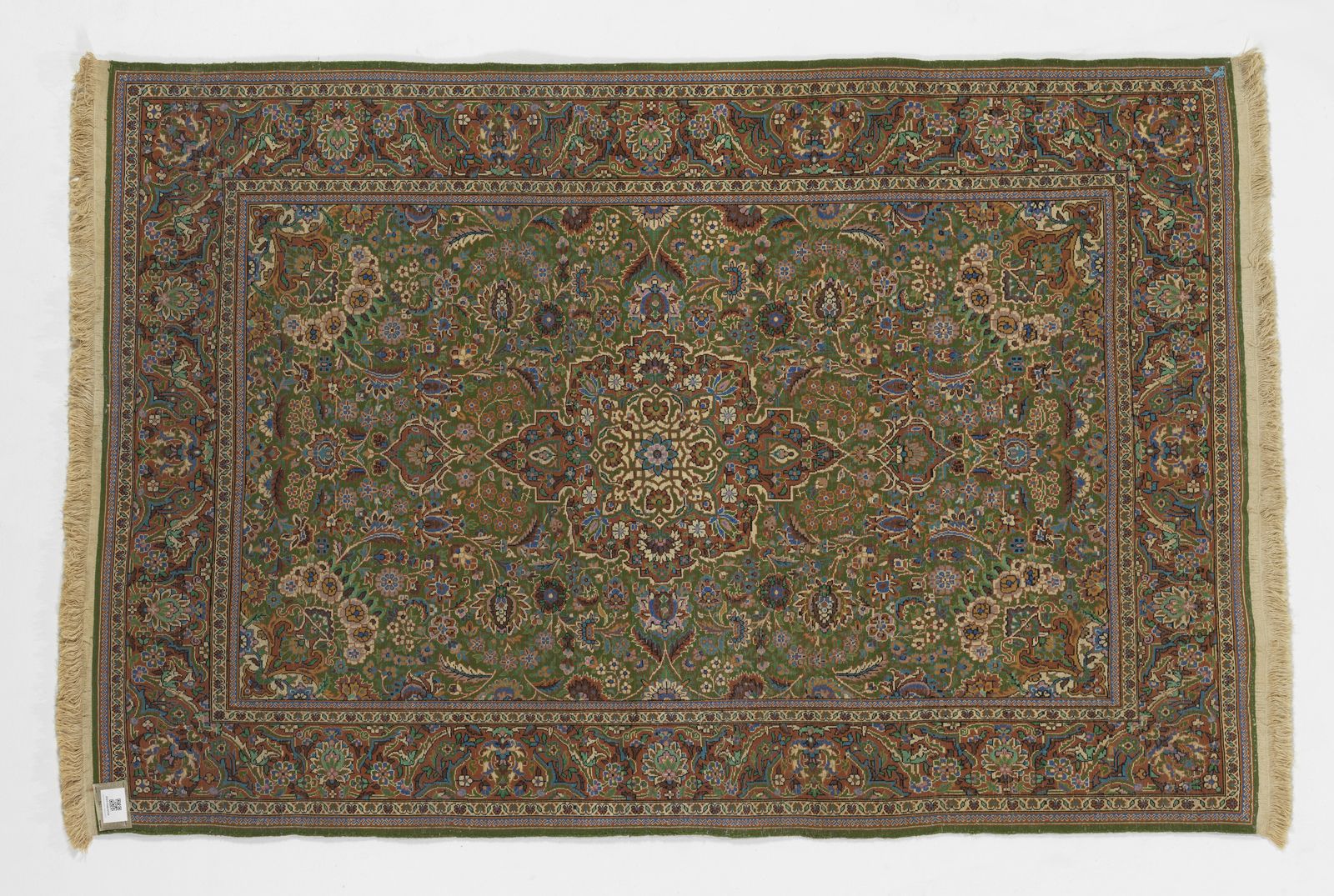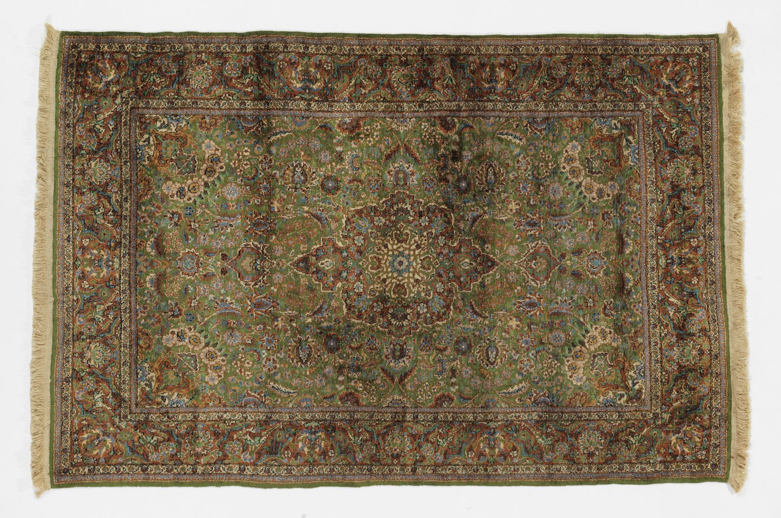 Tappeto Kashmir, India, XX secolo, campo verde con decori naturalistici e medaglione [..]