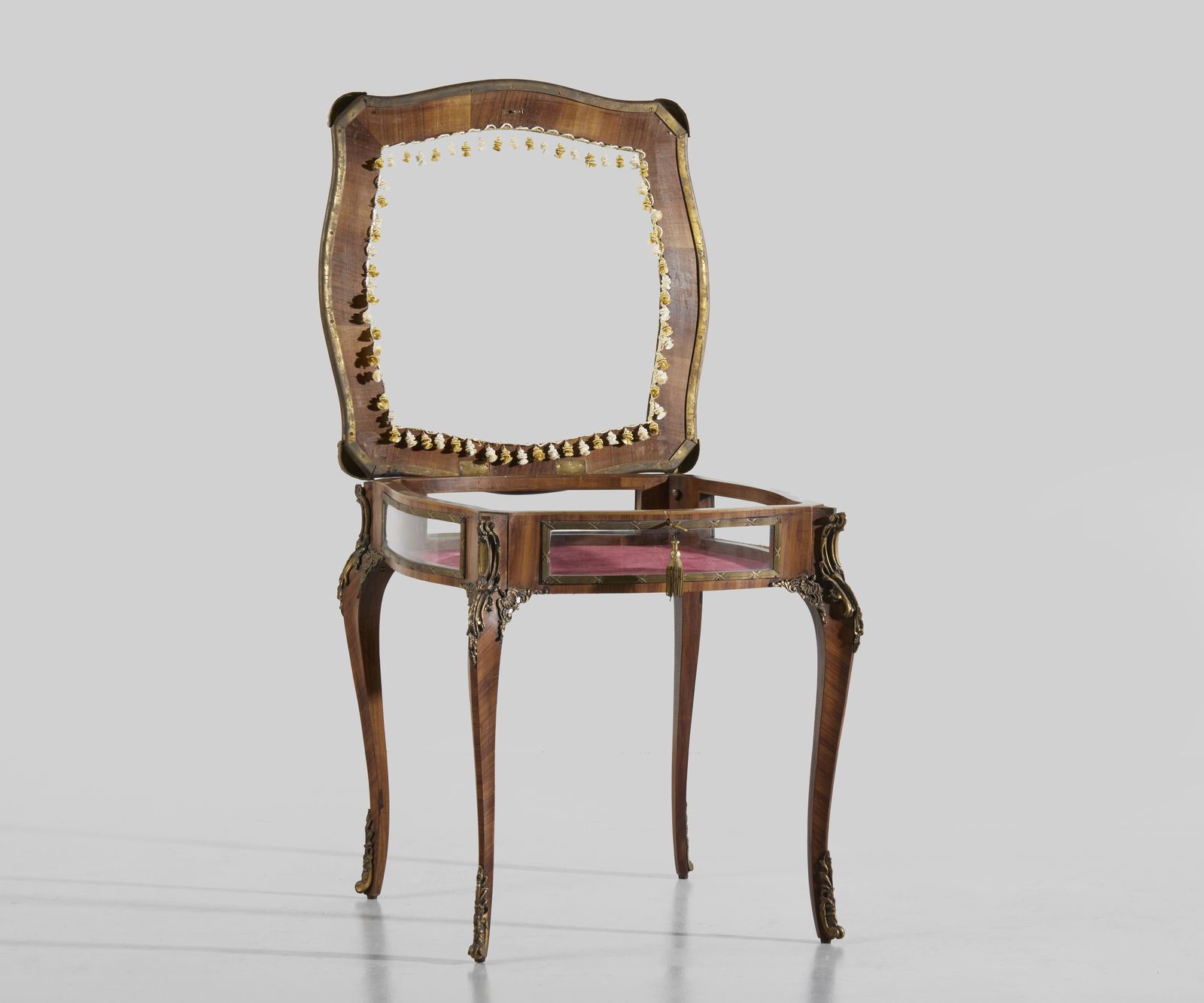 Tavolino espositore lastronato, in stile Luigi XV, con decorazioni e profili in [..]
