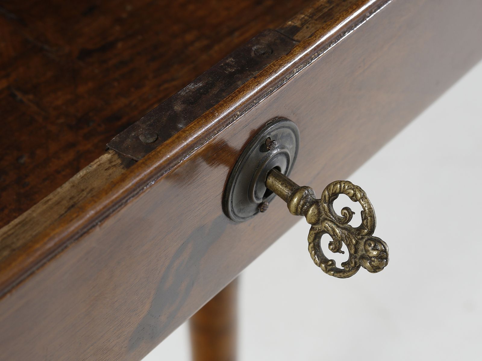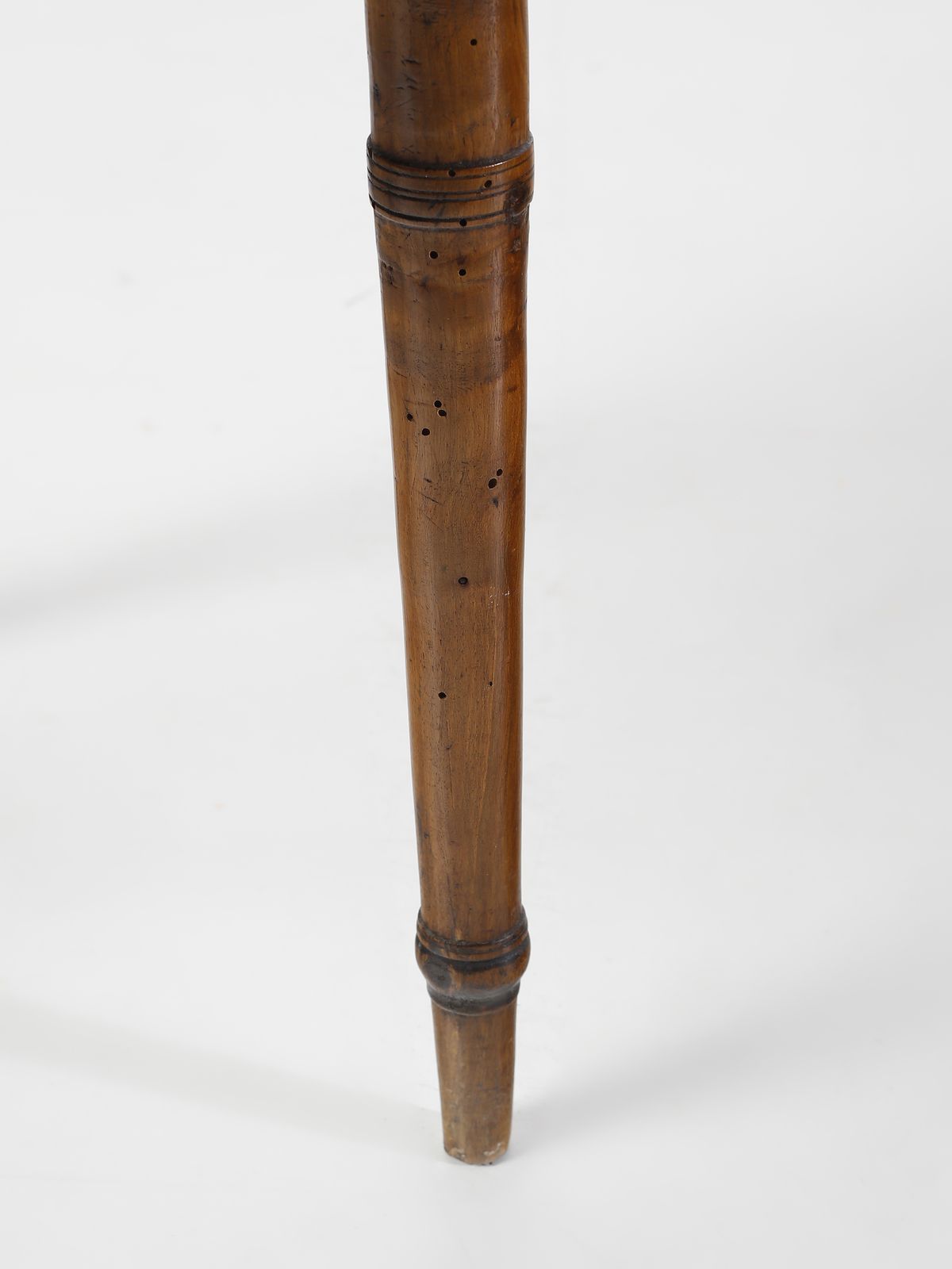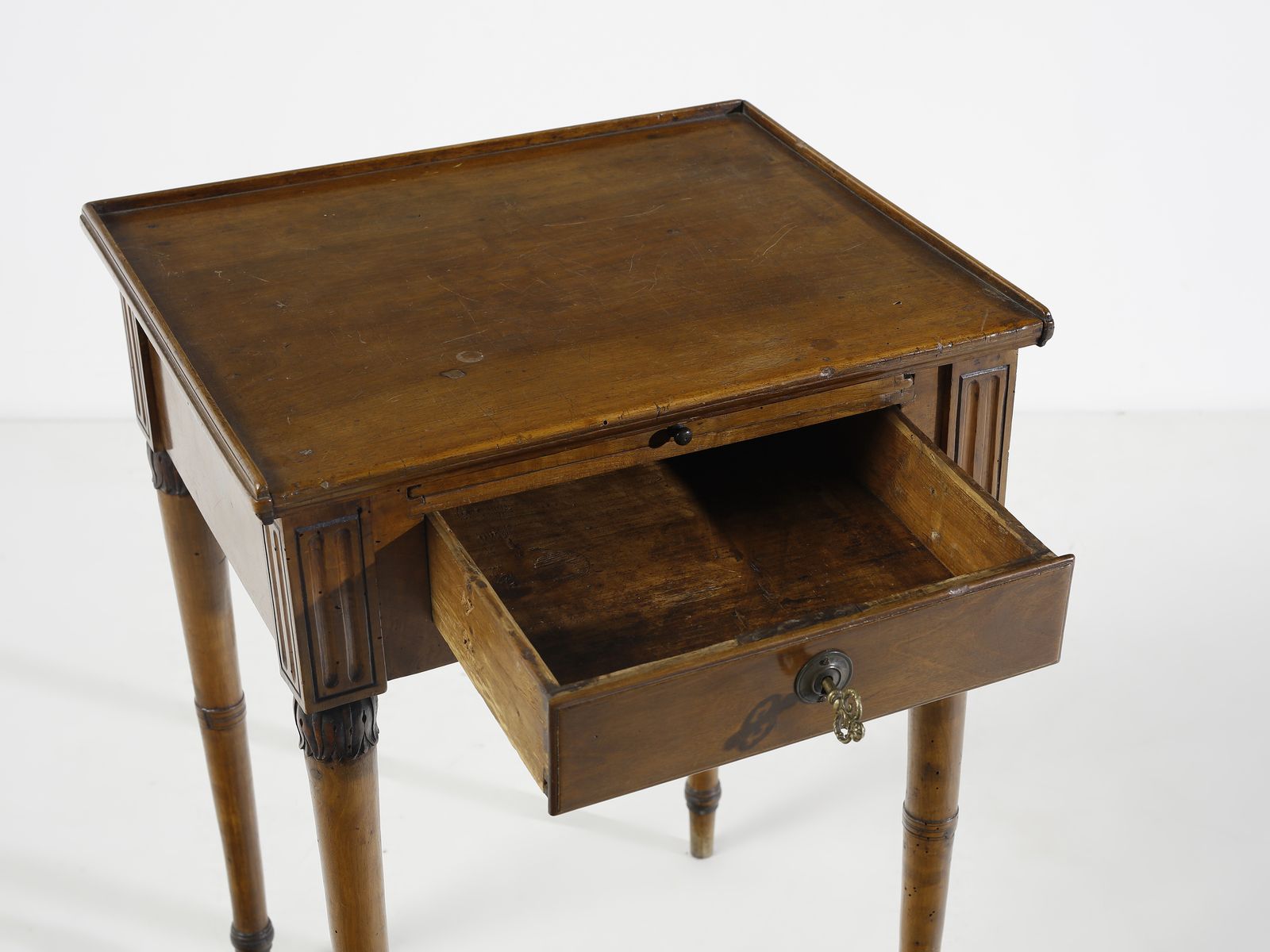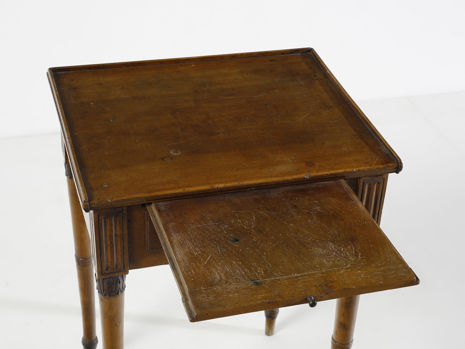 Tavolino in legno di noce, cassetto sul fronte, gambe a faretra