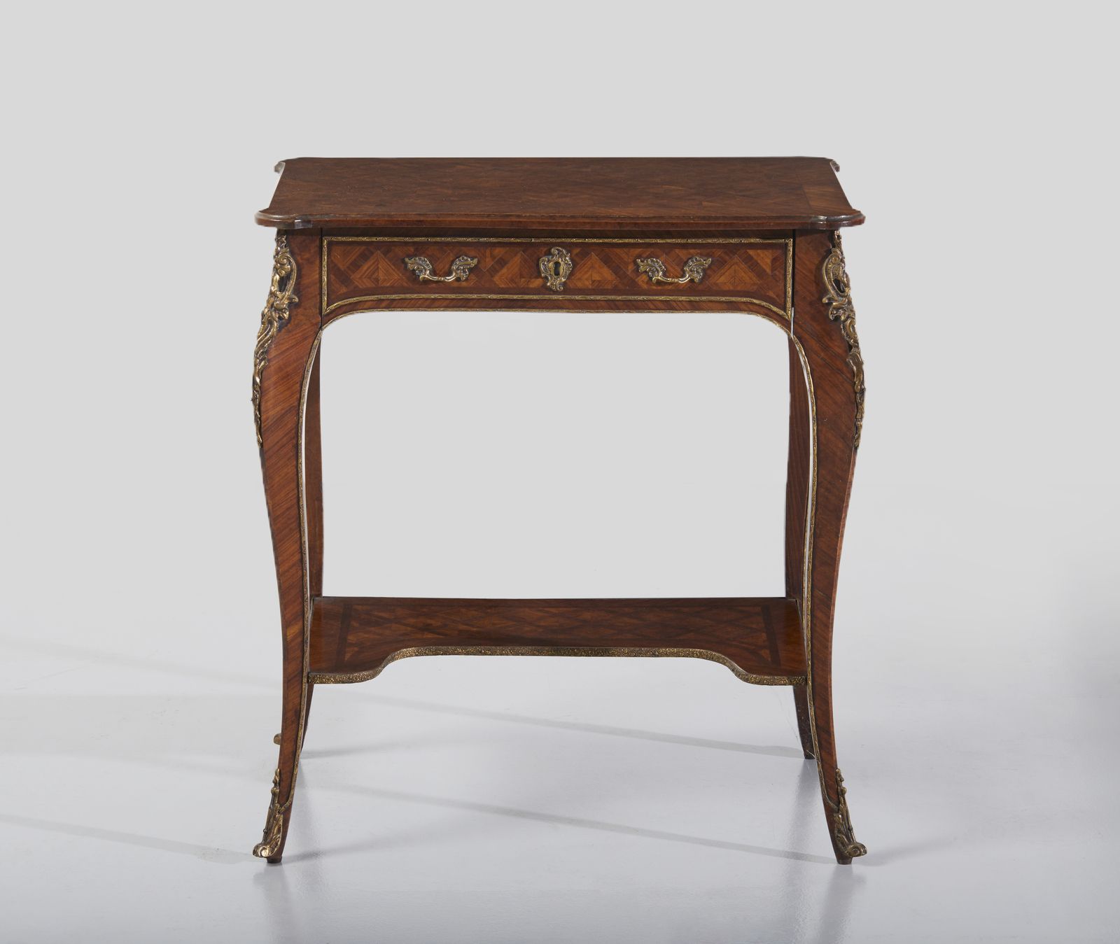 Tavolino lastronato e intarsiato in stile Luigi XV con applicazioni in metallo dorato, [..]
