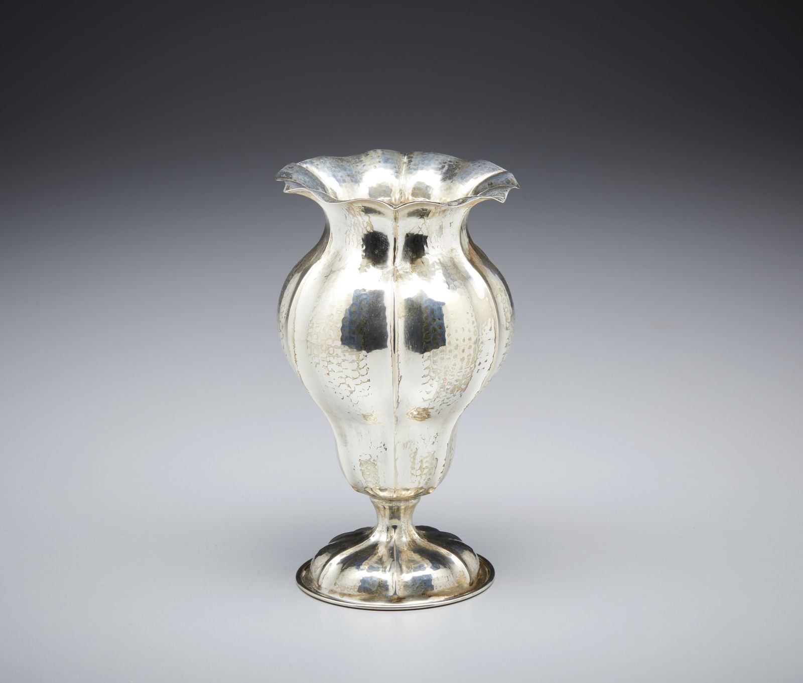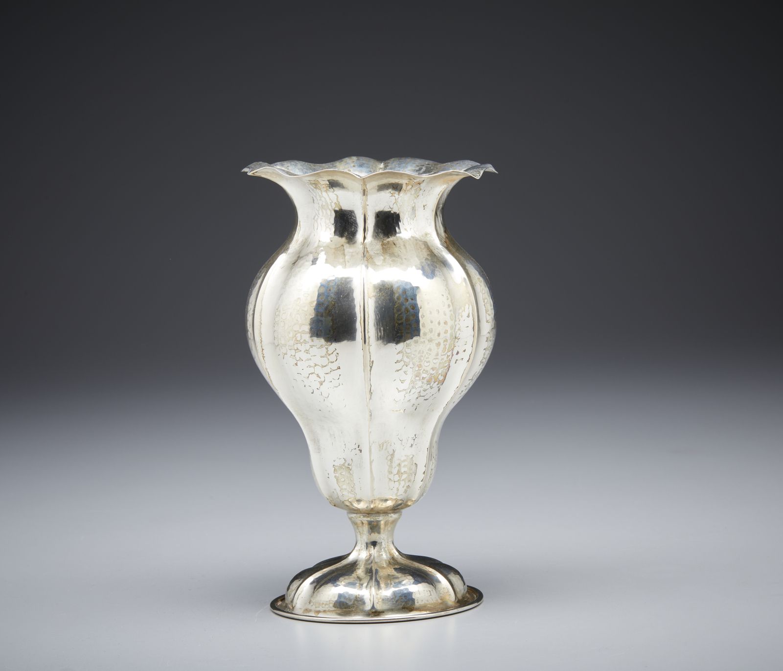 Vaso a balaustro in argento sbalzato con scanalature, orlo polilobato e piede ci [..]