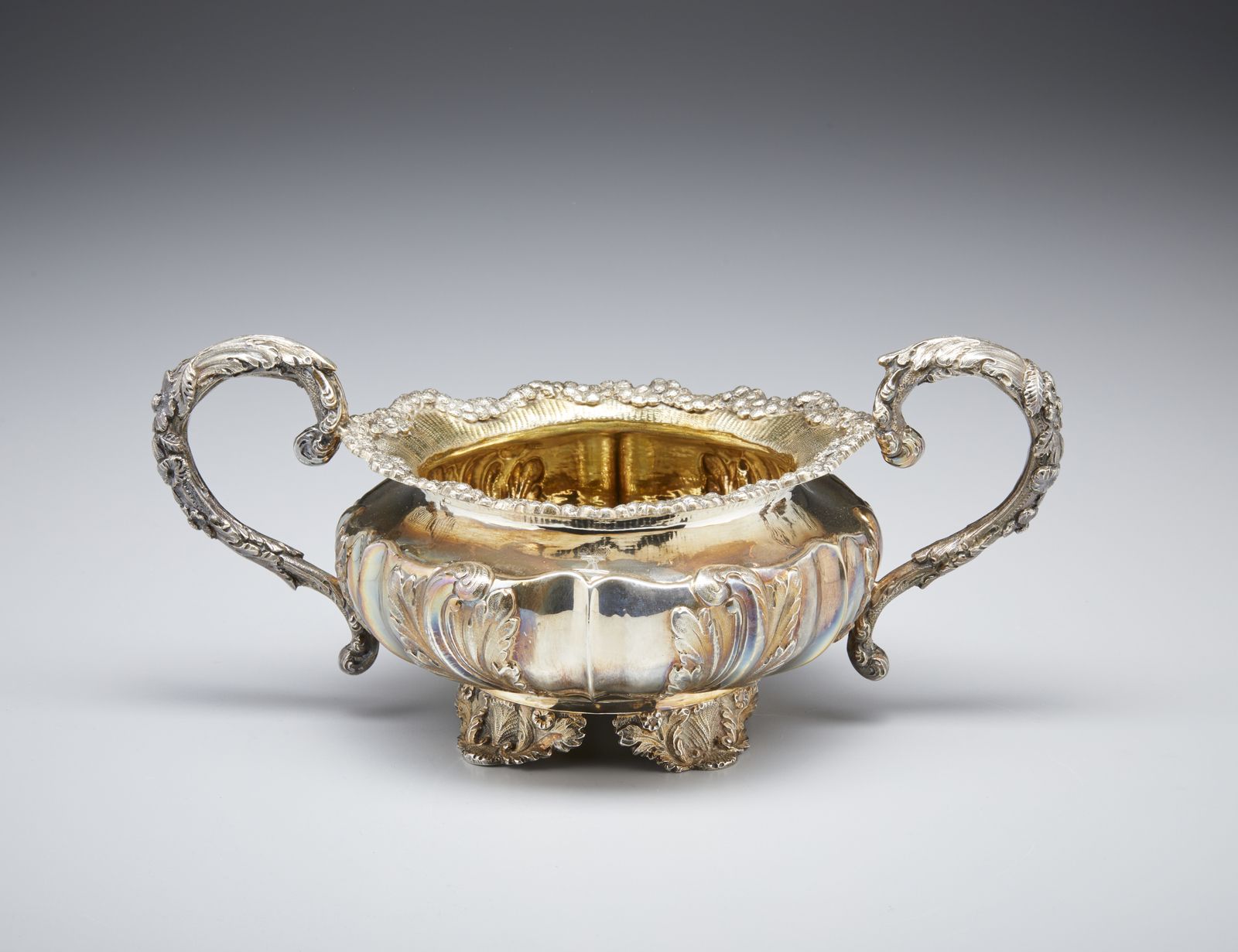 Zuccheriera in argento di forma circolare, corpo baccellato e decorato a motivi [..]