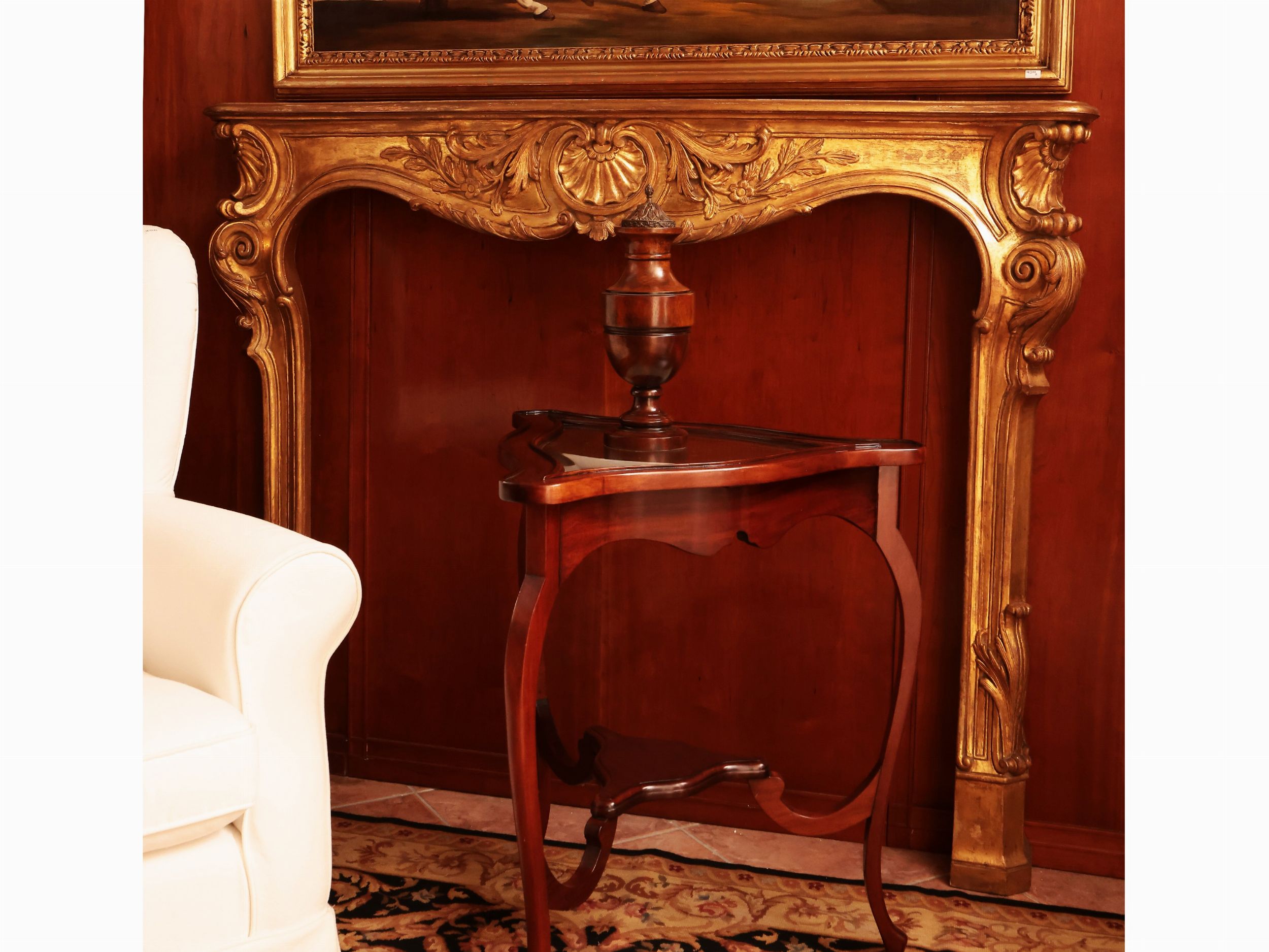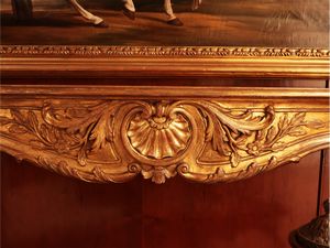 piano con bordo mosso, pendaglina intagliata con motivo a conchiglia tra tralci floreali e foglie d'acanto, montanti con motivo a doppia voluta