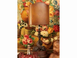 Lume da tavolo in metallo patinato e cuoio
