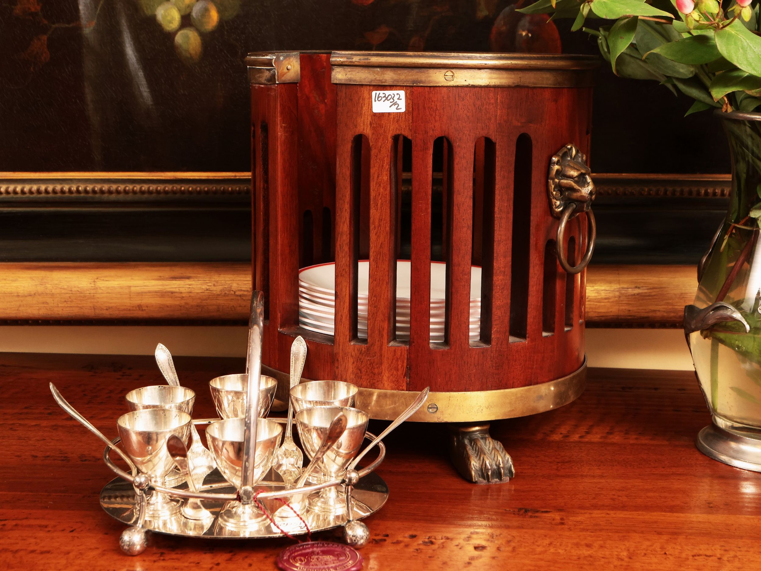 composto da un portapiatti in satinwood, di forma cilindrica, dettagli in metallo, ed un set portauova in metallo argentato, corredato da sei cucchiaini