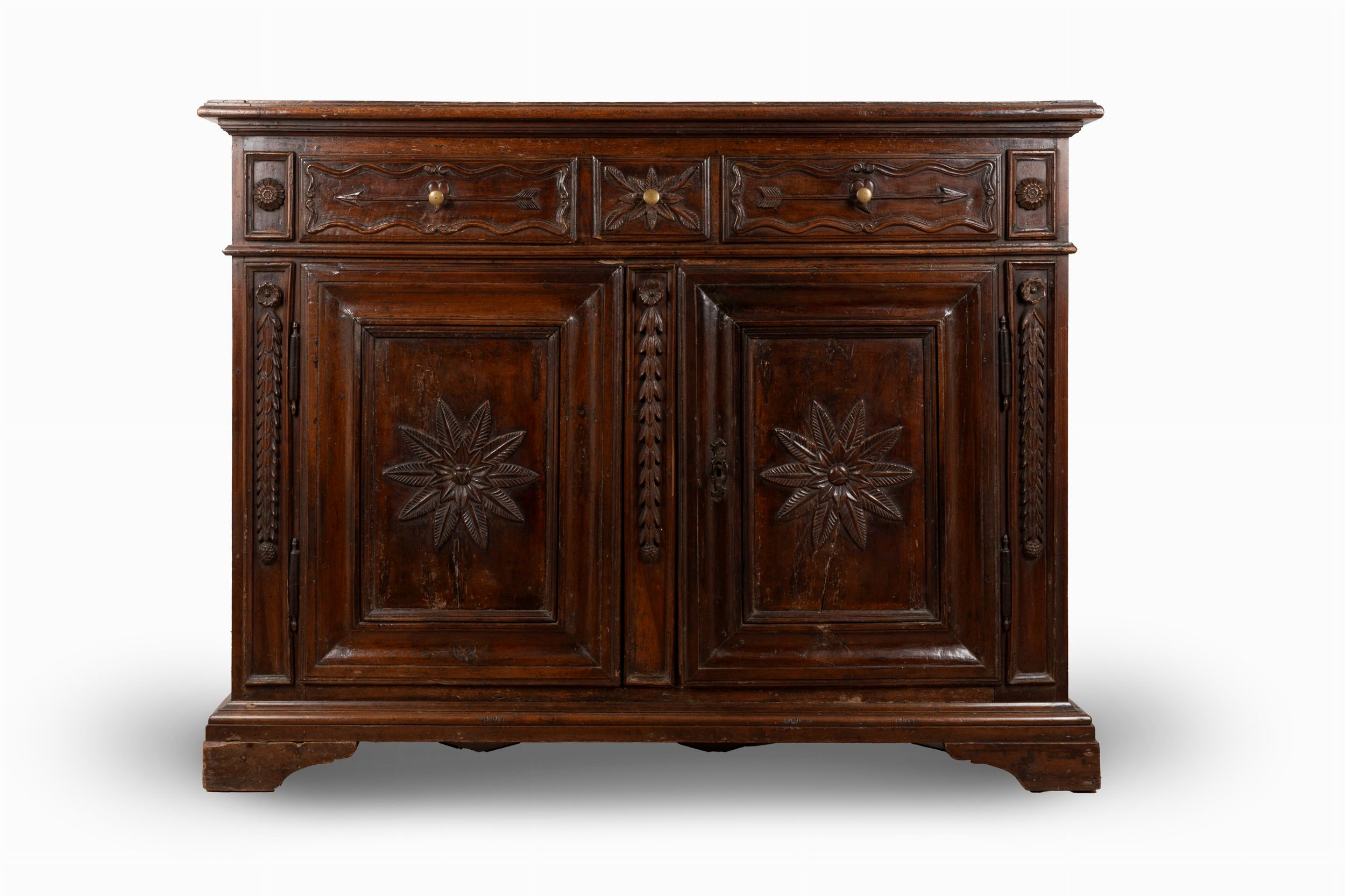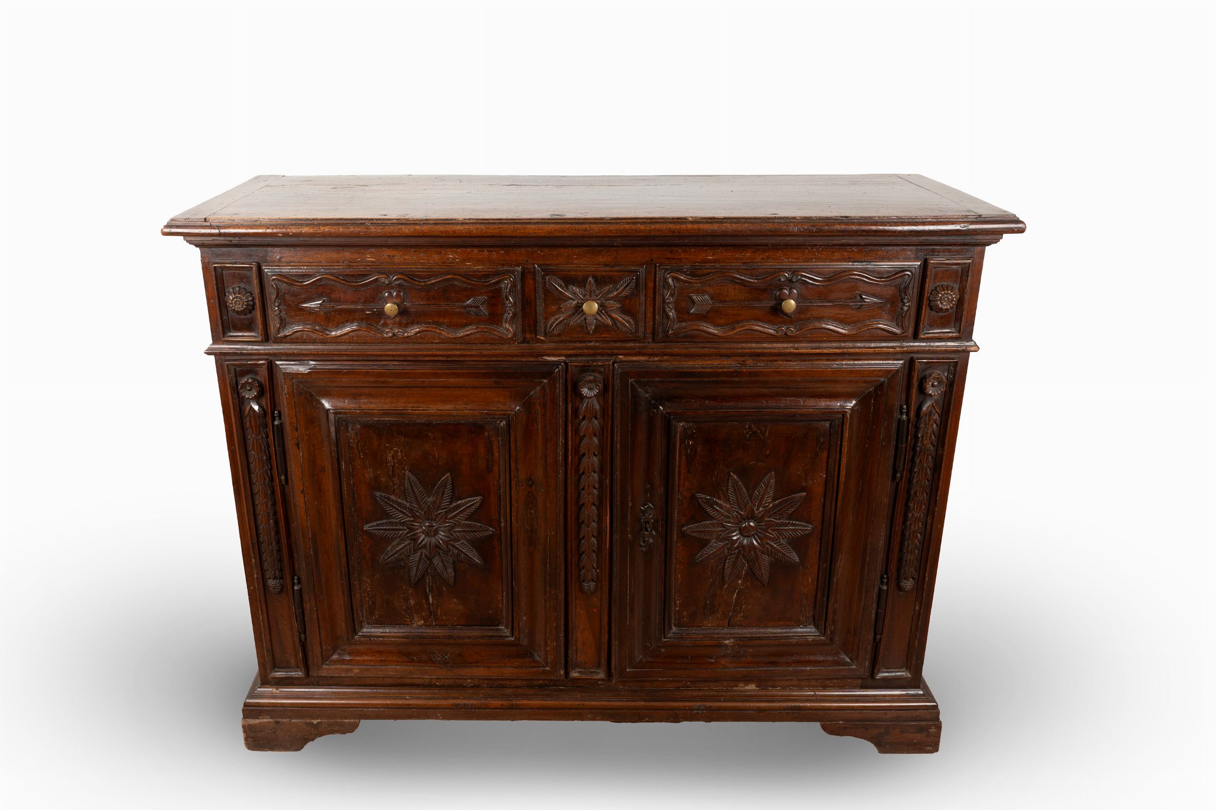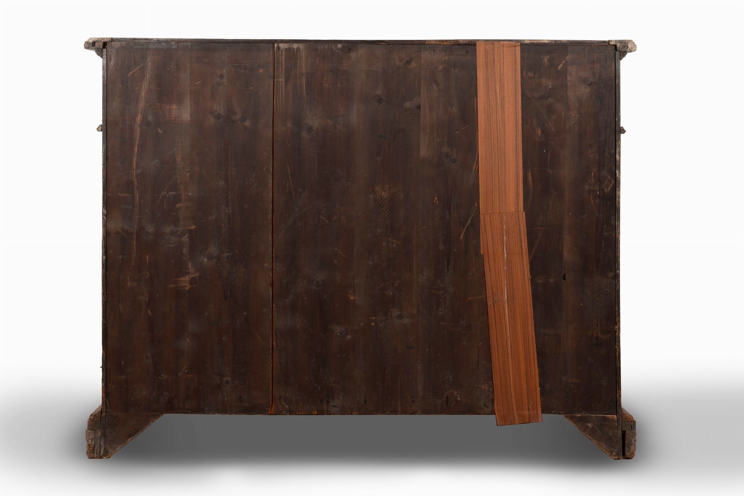 cm 116 x 151 x 53 nella parte alta, sotto il piano, due cassetti laterali con cuore trafitto da freccia e uno centrale più piccolo; nella parte bassa due sportelli con decori a fiori; terminate con piedi a mensola sostituzioni e integrazioni