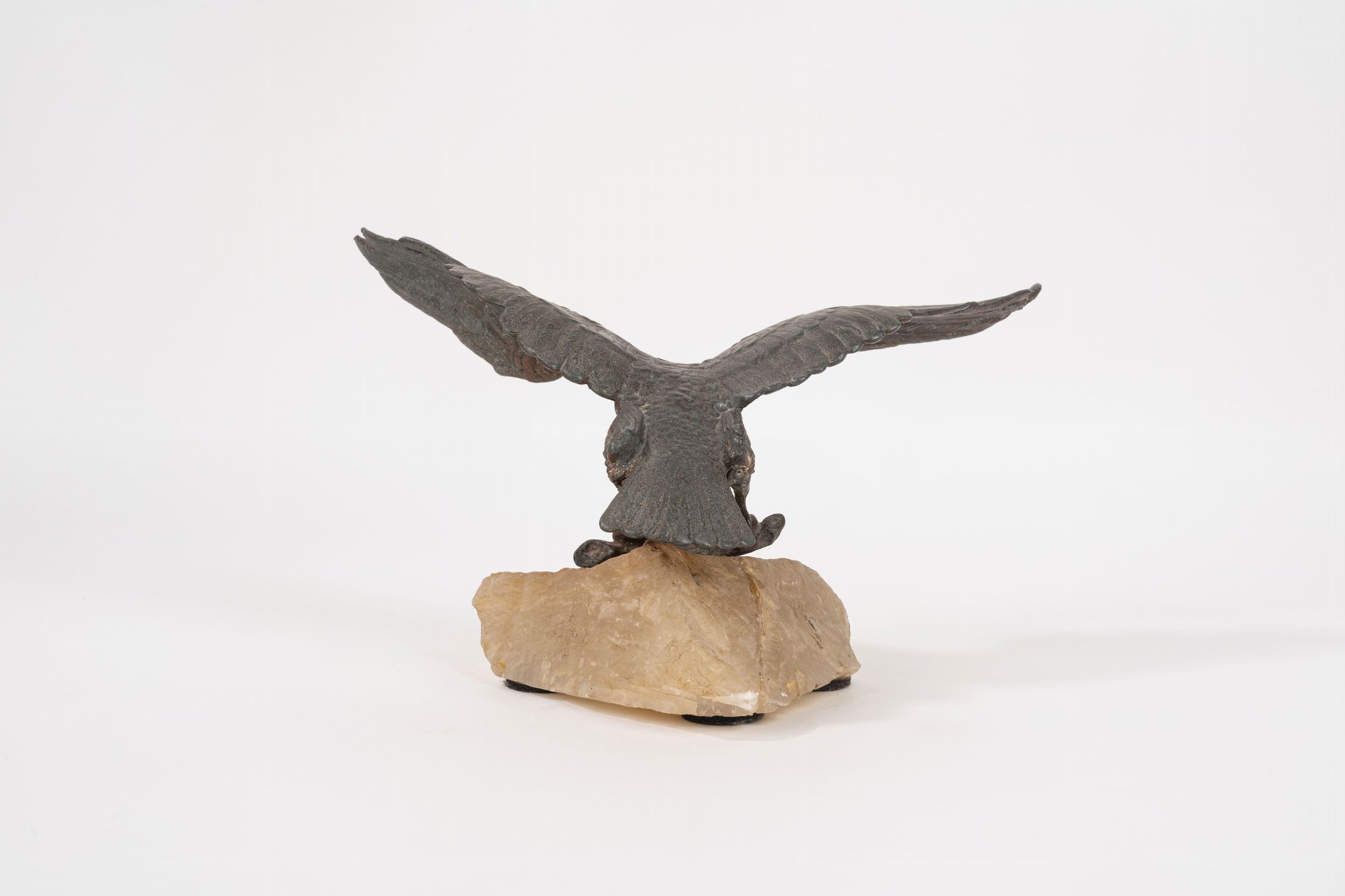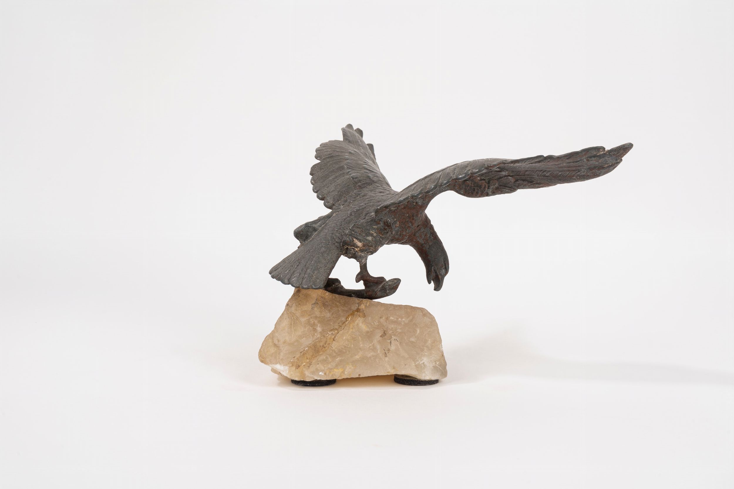 scultura in bronzo a patina scura su base in travertino, cm 20 x 28 x 11