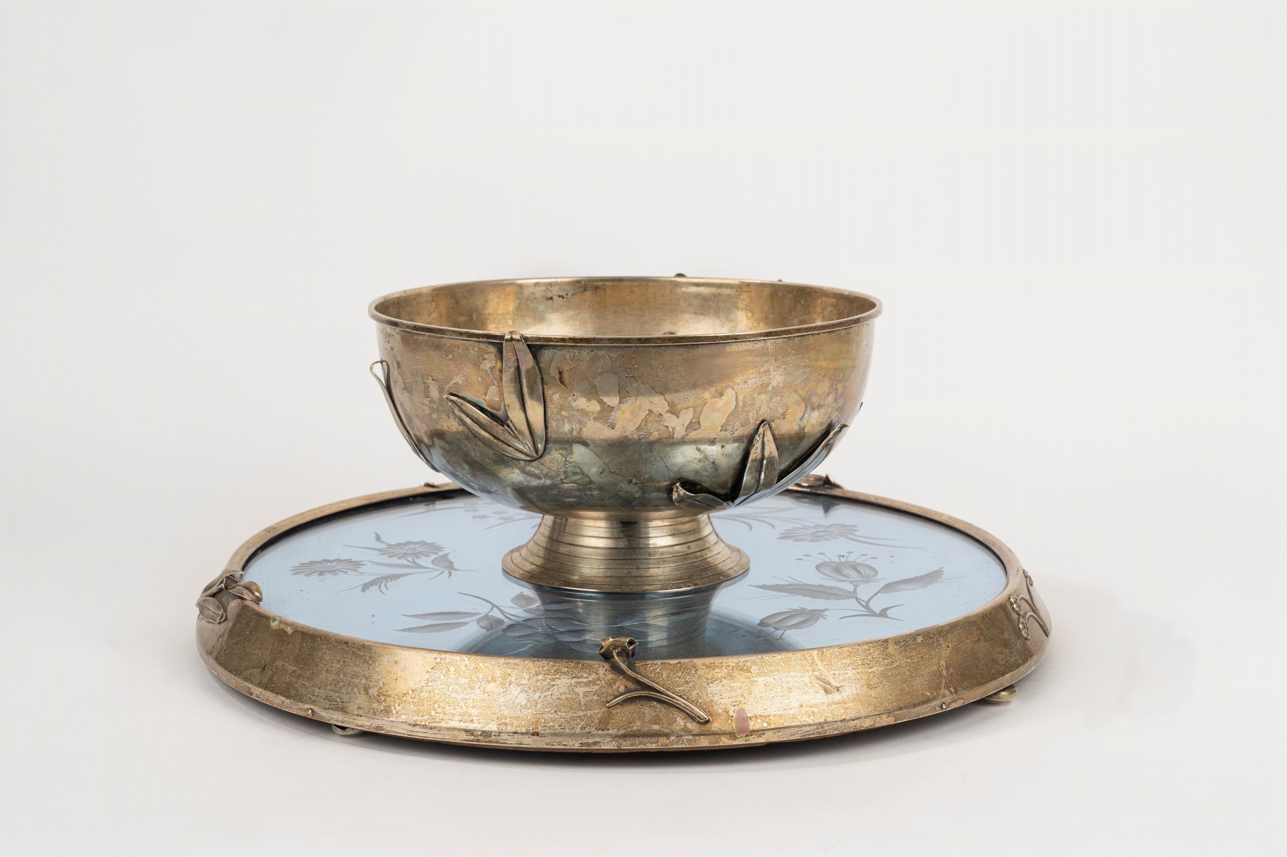 composto da vassoio con bordo in argento e piano in specchio decorato a motivi floreali, e ciotola in argento bollo 800 Torino