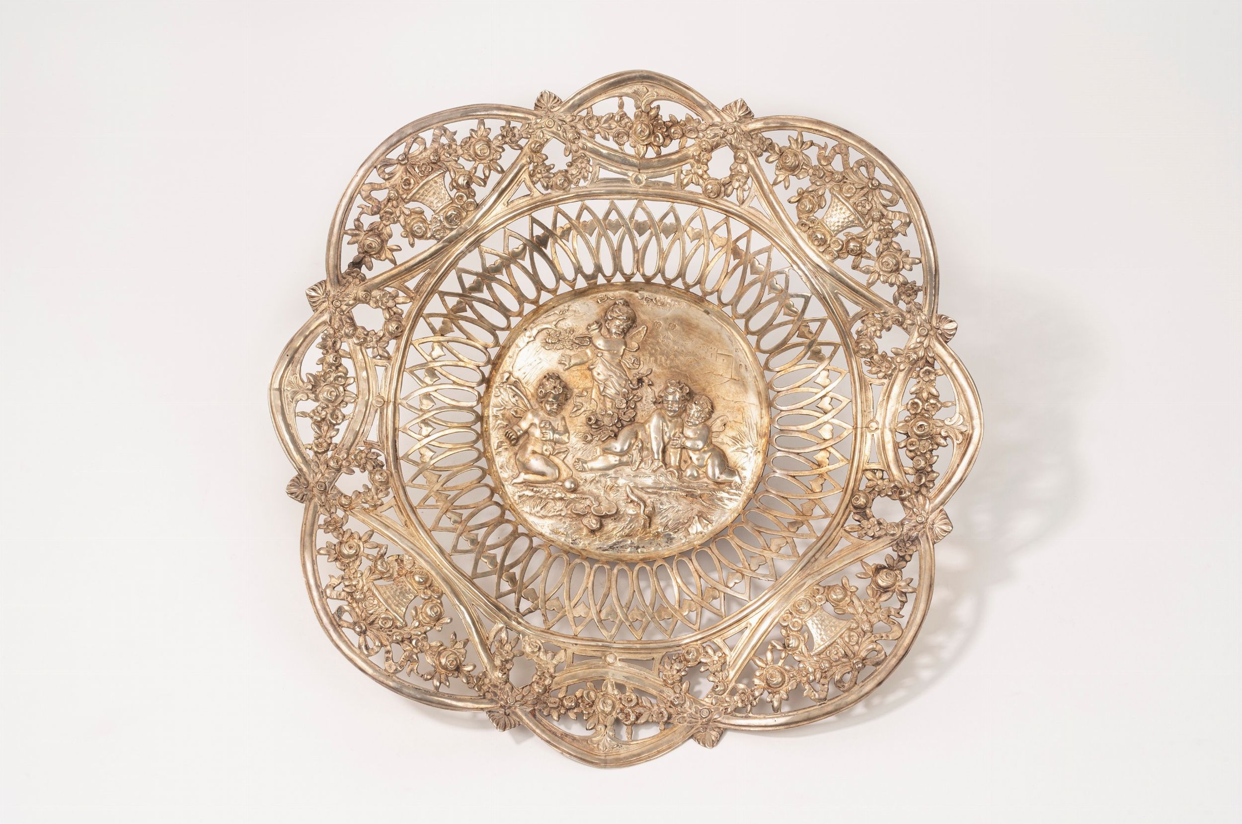 traforato con motivi floreali e a cuore; raffigurante scena di putti al centro peso totale 475 gr