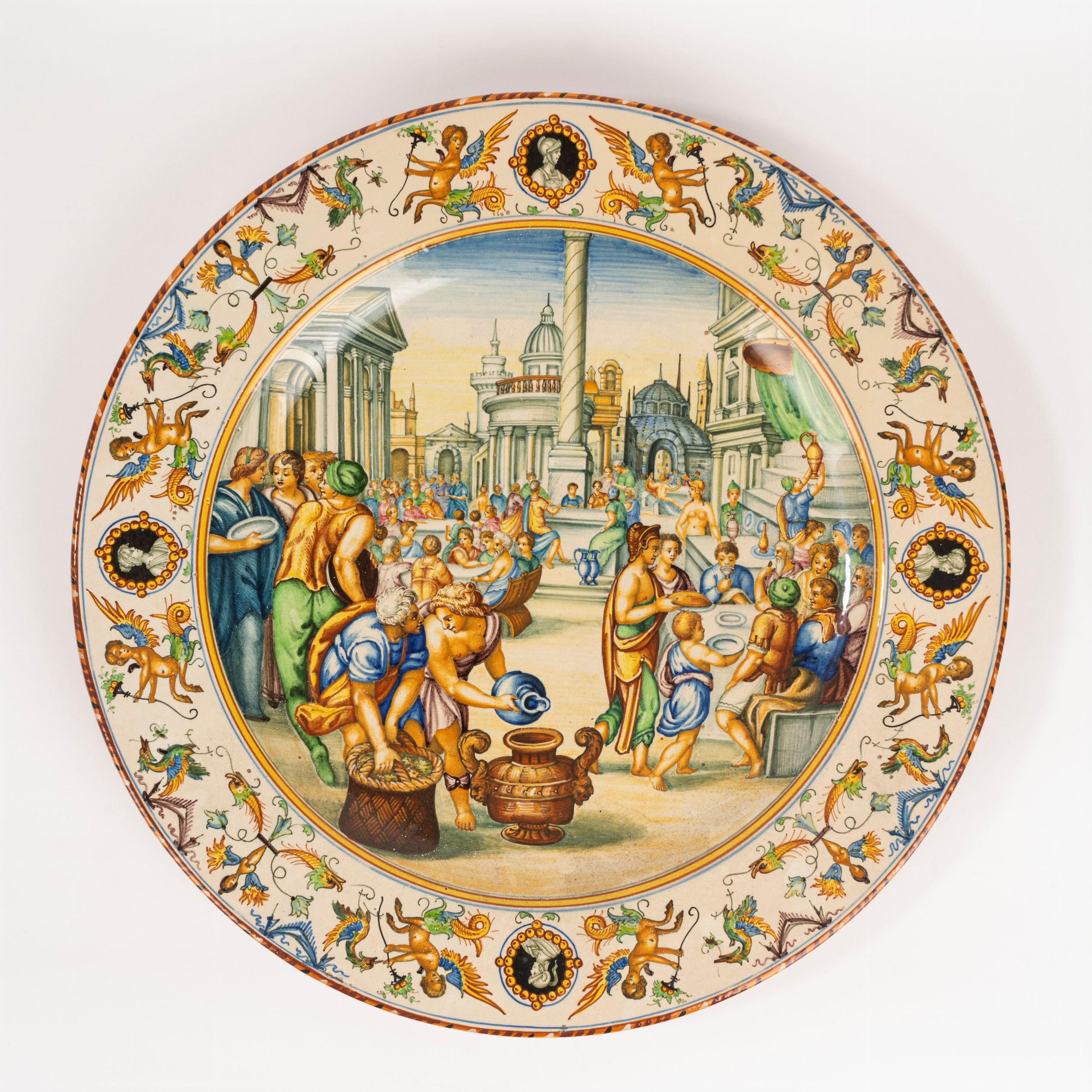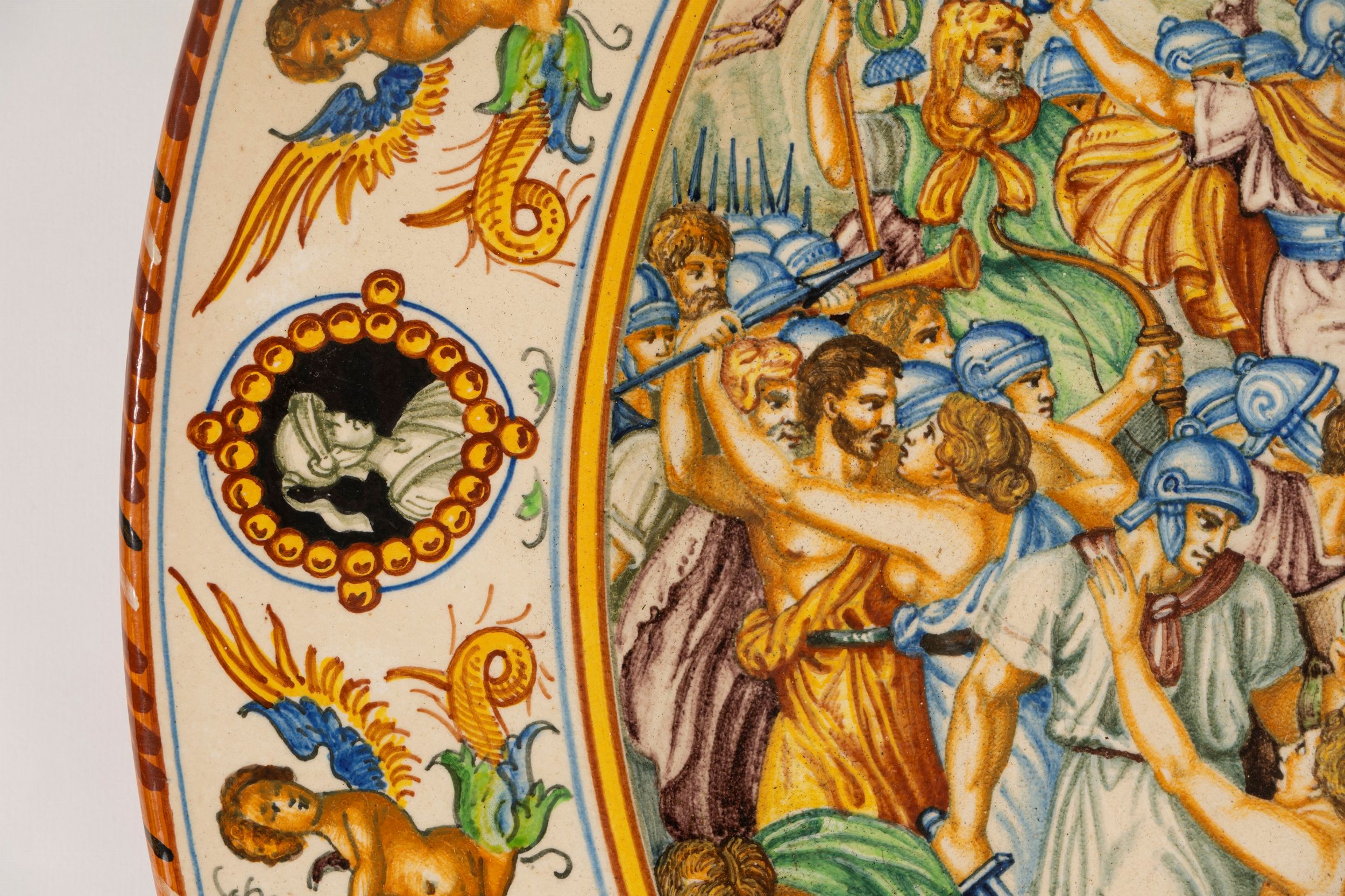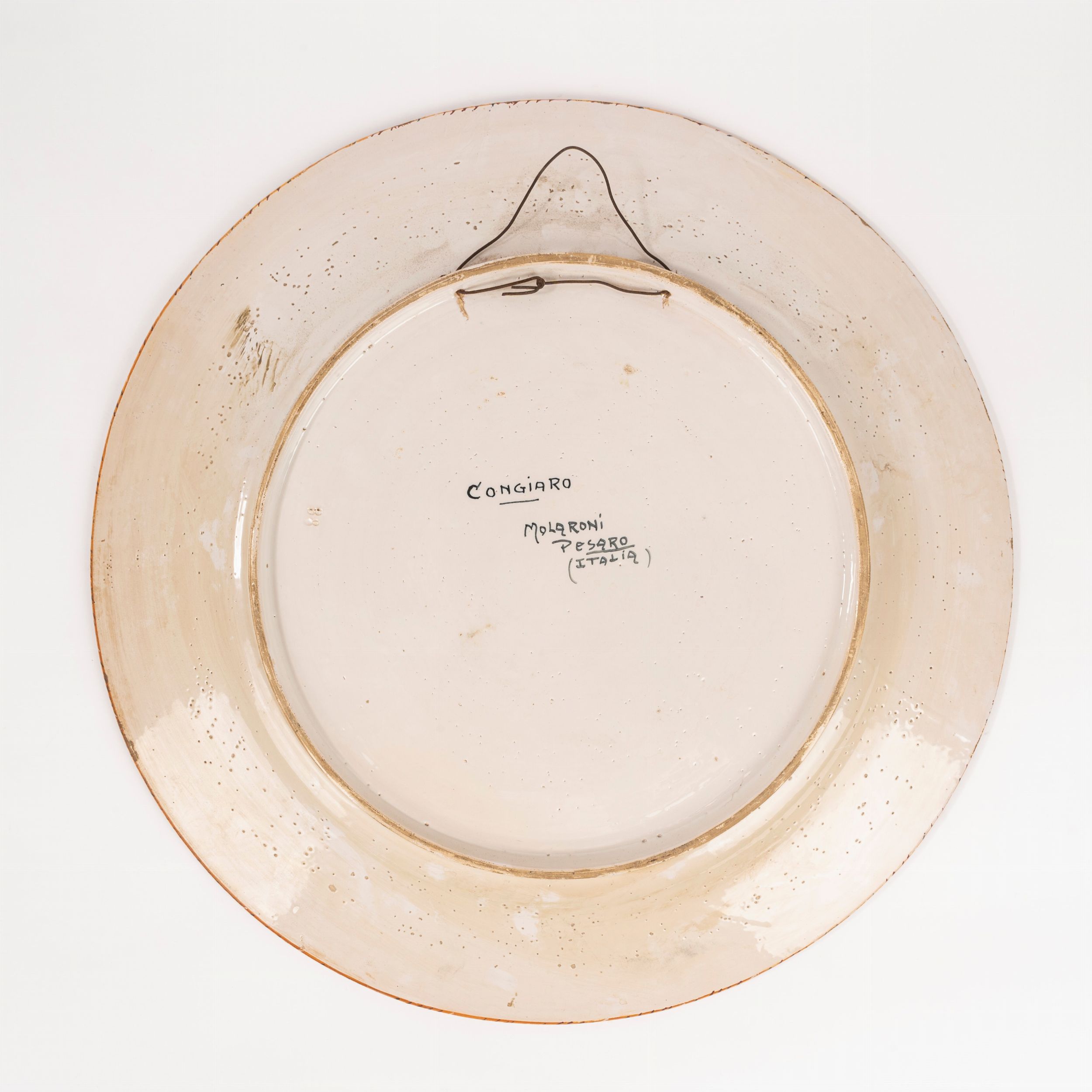 diametro cm 50,5 ciascuno uno raffigura il Ratto delle Sabine, l'altro il Congiaro (distribuzione al popolo di vino e olio); entrambi hanno la tesa decorata con grottesche e profili classici entro clipei iscrizioni sul retro: i Romani e Sabini separati dalle donne Sabine / Molaroni -Pesaro Italia ; e Congiaro / Molaroni - Pesaro Italia