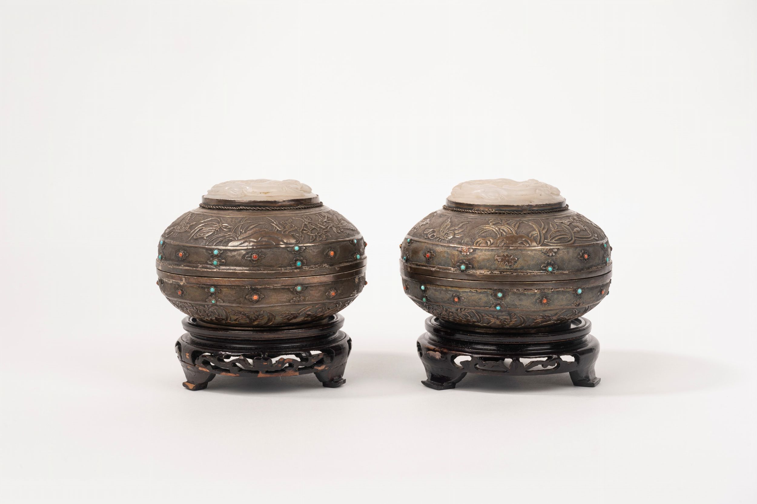 Coppia di scatole in metallo argentato, con coperchio in giada bianca, Cina secolo [..]
