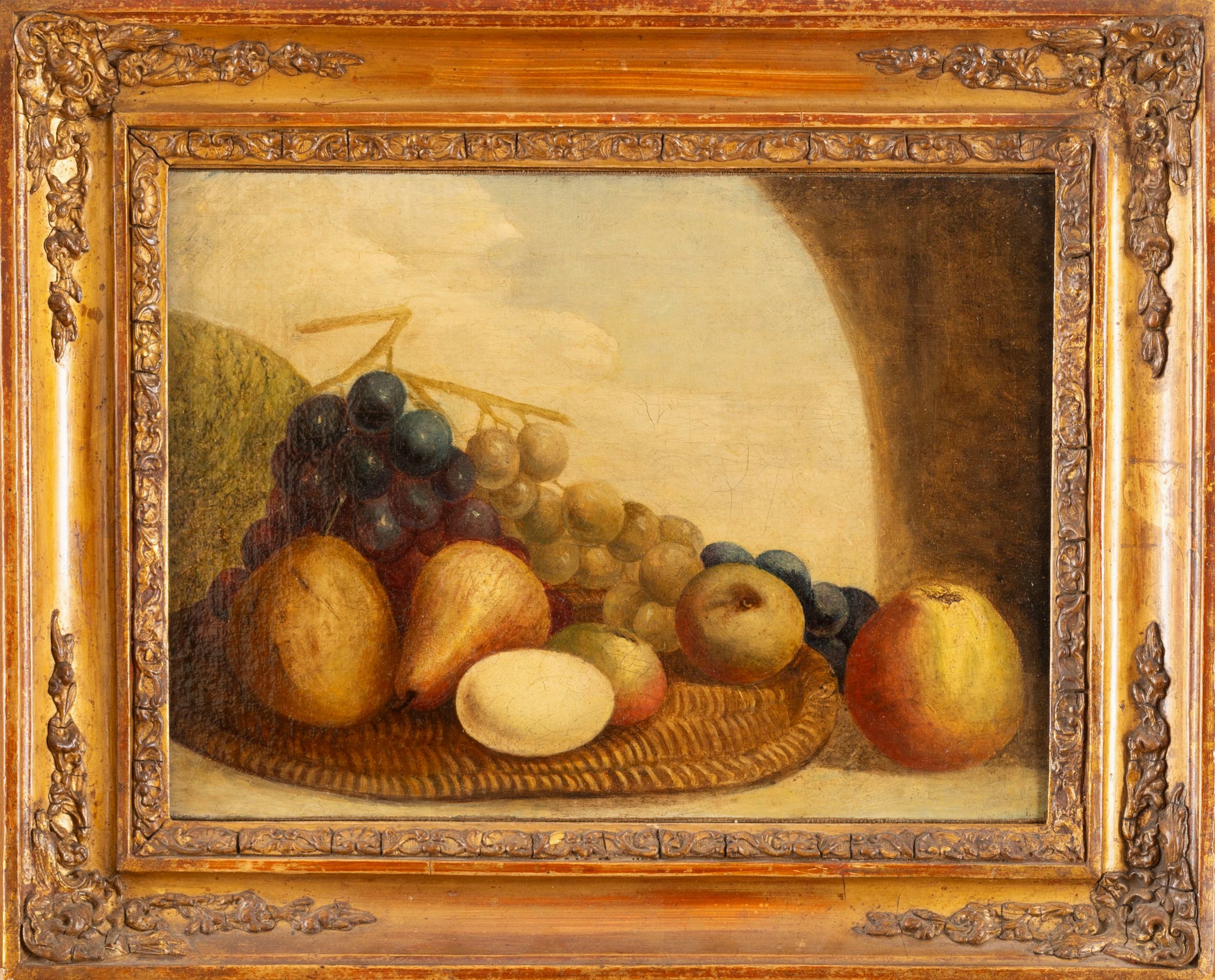 una con ananas e frutti su un tavola, una con pere, uva e un uovo
