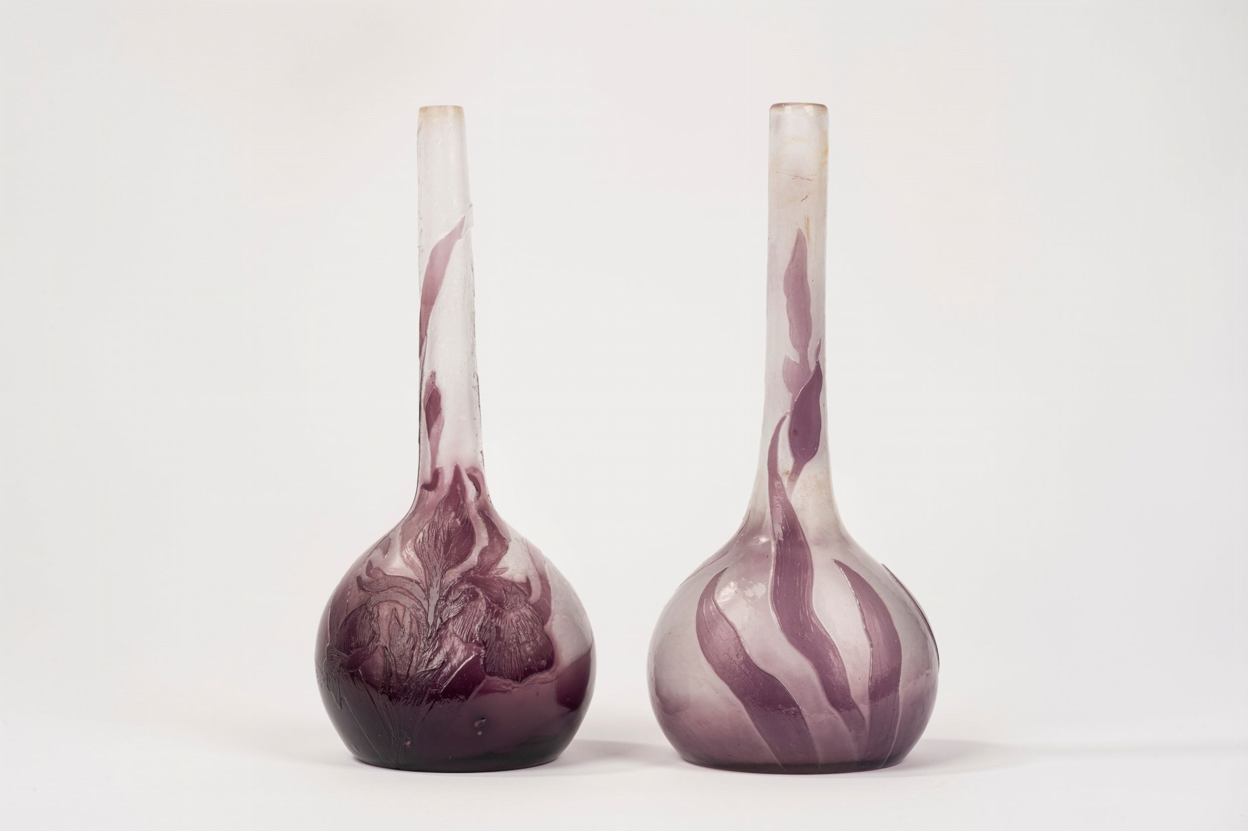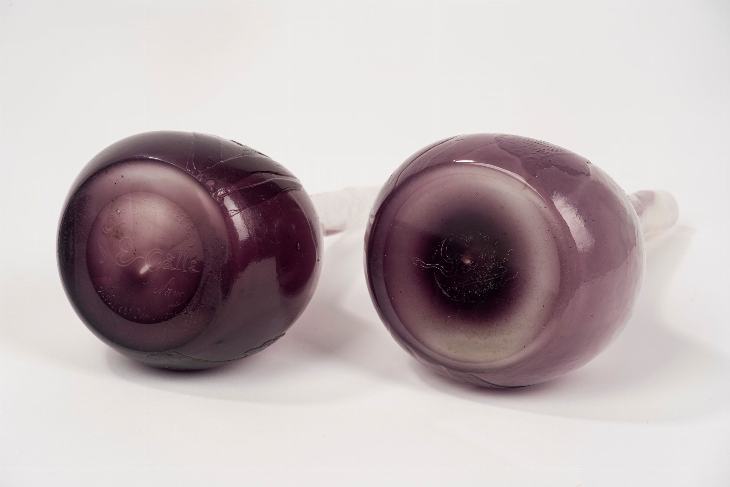 lavorati all'acido, con motivi floreali uno con iris firmato sotto la base Cristallerie /E Gallè/ Nancy/ Modele [...] l'altro con calle firmato sotto la base inciso a punta di diamante Gallè déposé