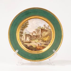 diametro cm 23 Con veduta del lago di Bolsena dipinta nel cavetto, tesa in verde e oro iscrizione sul retro Vue [..]