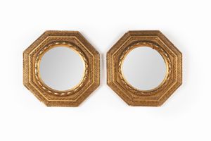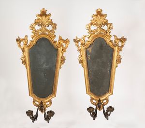cm 74 x 42 ciascuna in legno intagliato e dorato, con applique a due luci, specchio al mercurio difetti e mancanze [..]