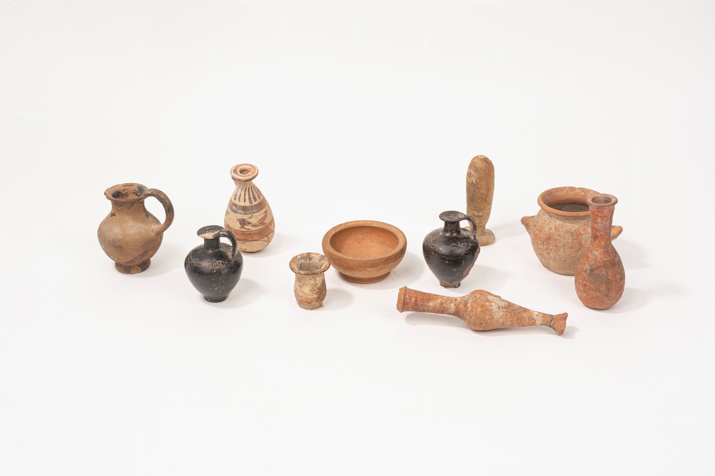 - Unguentario in argilla chiara, II secolo a.C. altezza cm 14 - Coppia di Aryballos in bucchero, VII secolo a.C., altezza cm 7 ciascuno - Olpe in vernice nera, IV secolo a.C. altezza cm 8 - Vasetto miniaturistico in ceramica comune, altezza cm 4,3 - Alabastron in ceramica etrusco - corinzia, VI secolo a.C., altezza cm 9 - Alabastron in alabastro, VII - VI secolo a.C, altezza cm 8.7 - Coppetta in argilla chiara, cm 3,5 x 8 - Unguentario in ceramica comune, I secolo d.C., altezza cm 10 - Olletta miniaturistica, VII - VI secolo a.C., cm 7 x 9 difetti e mancanze I reperti offerti nel lotto sono stati denunciati alla Soprintendenza Archeologica di Roma in data 01/09/2005