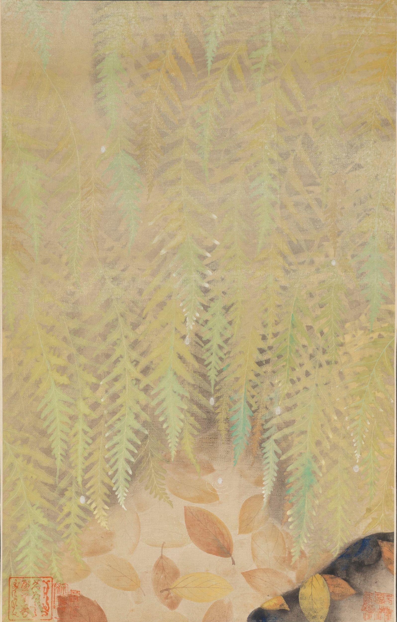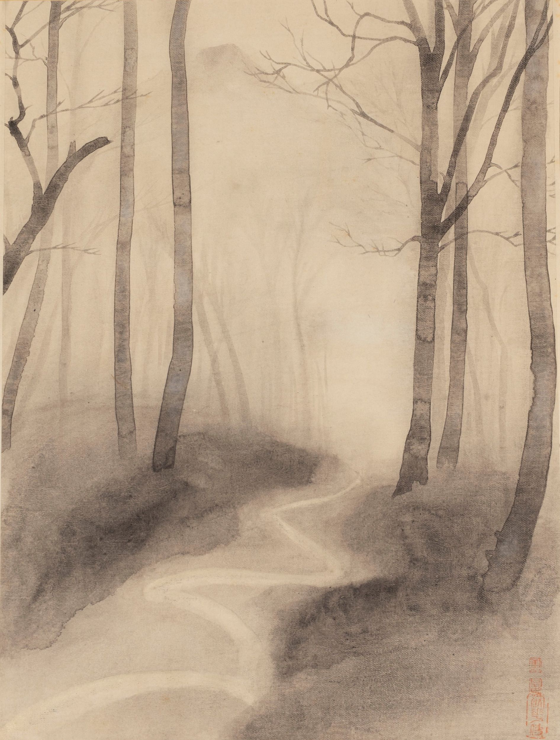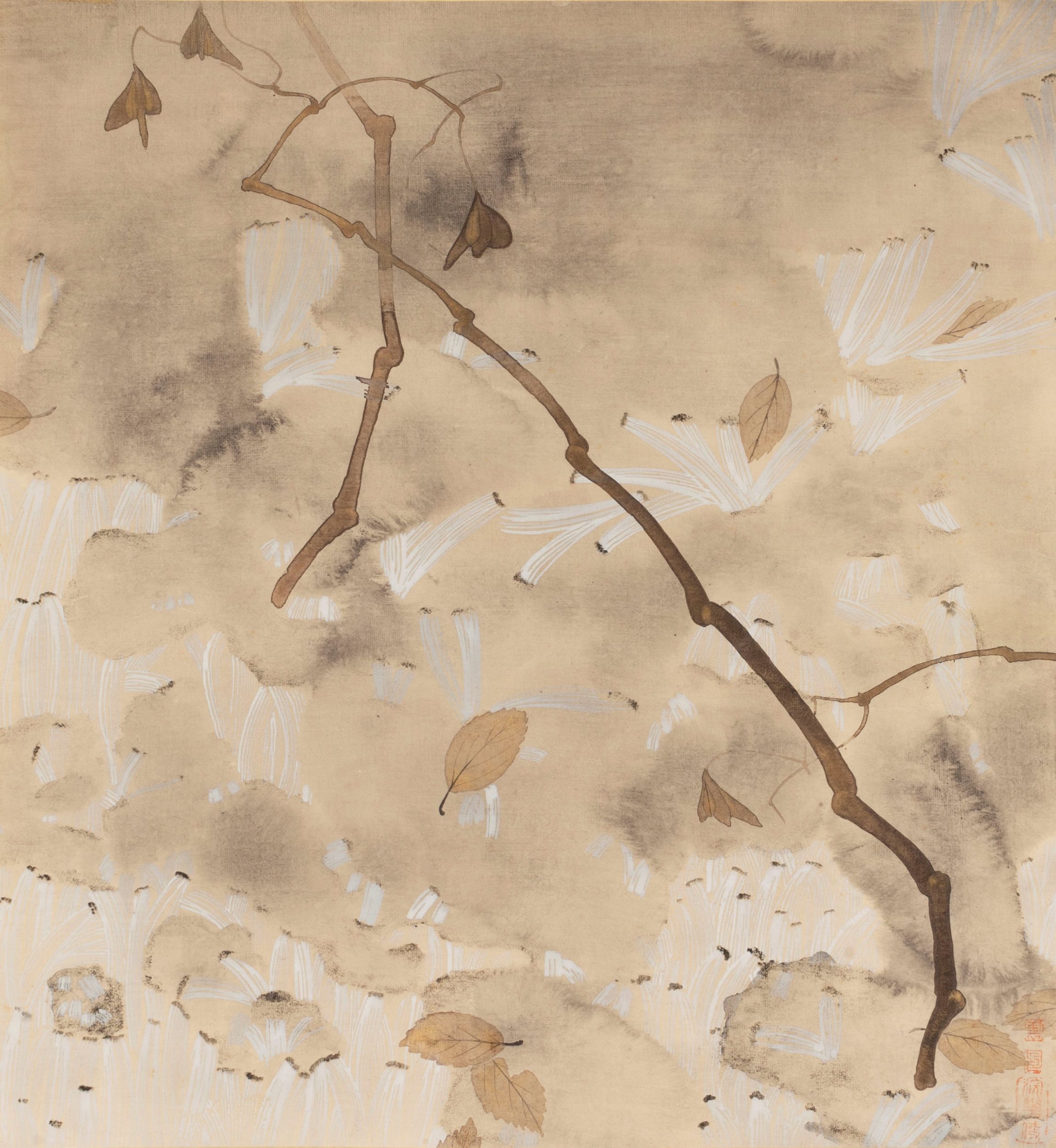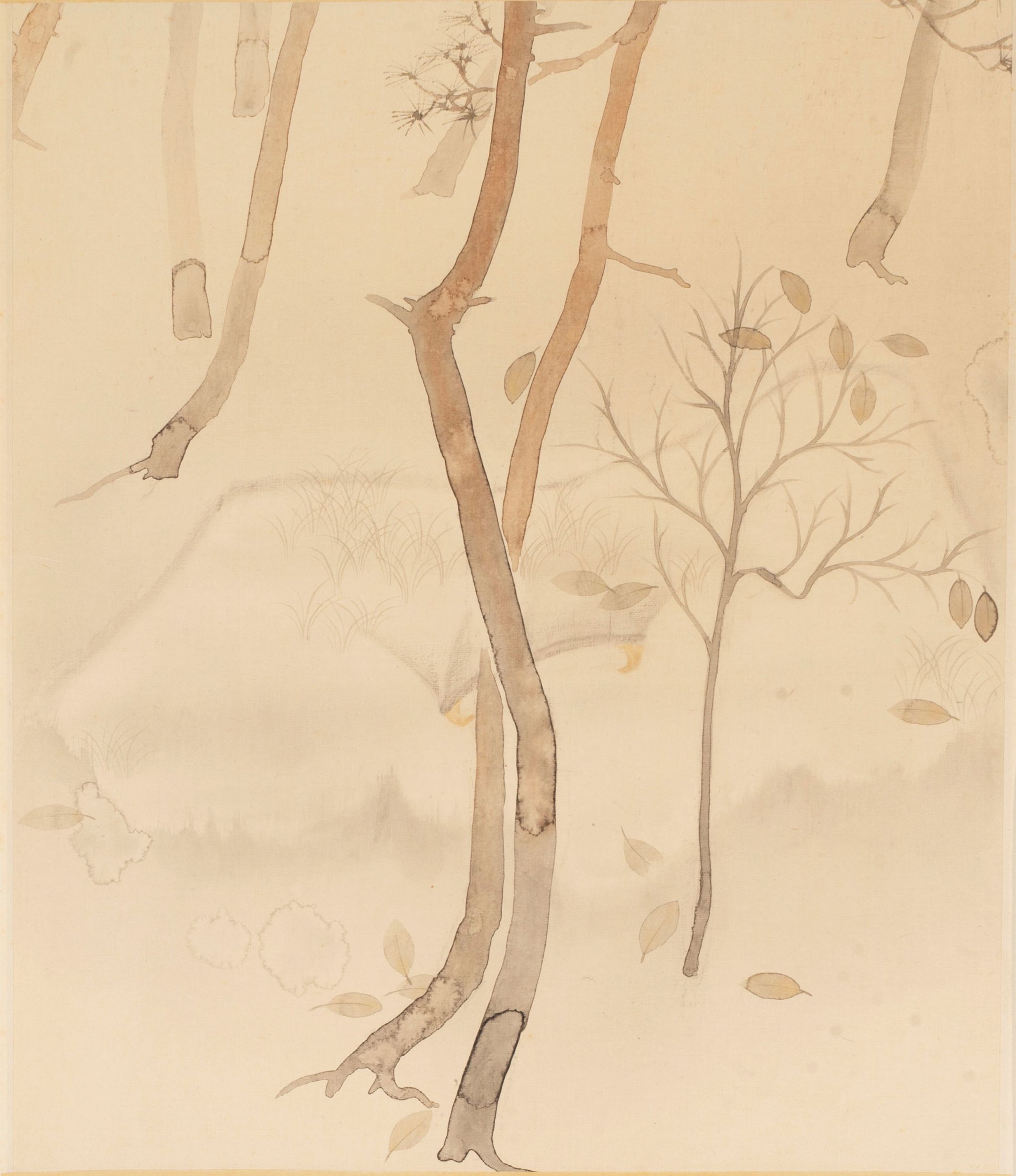 Lotto composto da quattro dipinti orientali su carta raffiguranti paesaggi autunnali, [..]