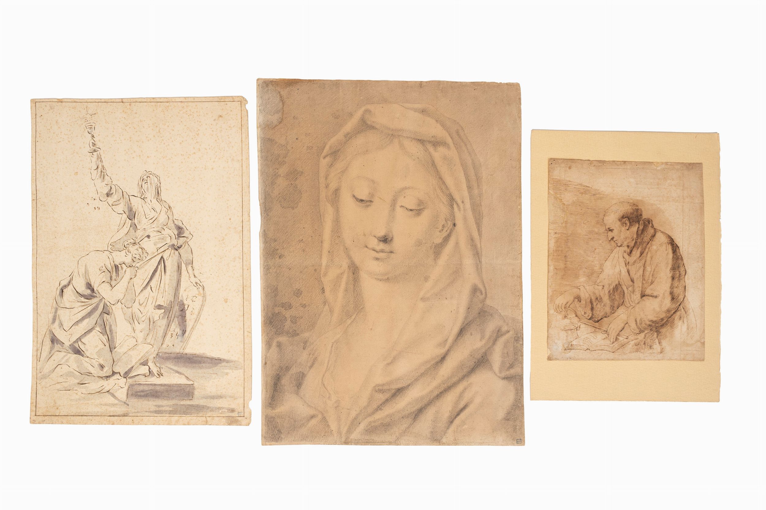 mm 470 x 340; mm 415 x 273 e mm 259 x 204 uno matita su carta raffigurante Madonna; uno inchiostro bruno acquerellato su carta raffigurante Allegoria della Fede; uno inchiostro bruno su carta raffigurante Frate i primi due con marchio di collezione AF in basso a destra